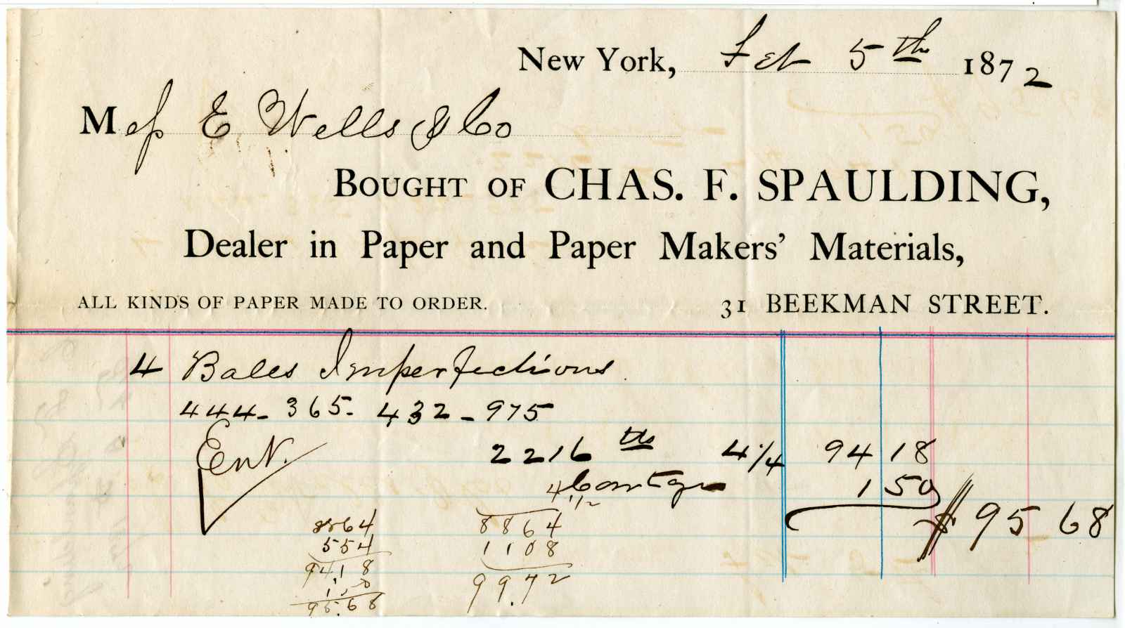 invoice; Spaulding, Charles F. & Co. - Paper & Paper Makers' Materials - N.Y.