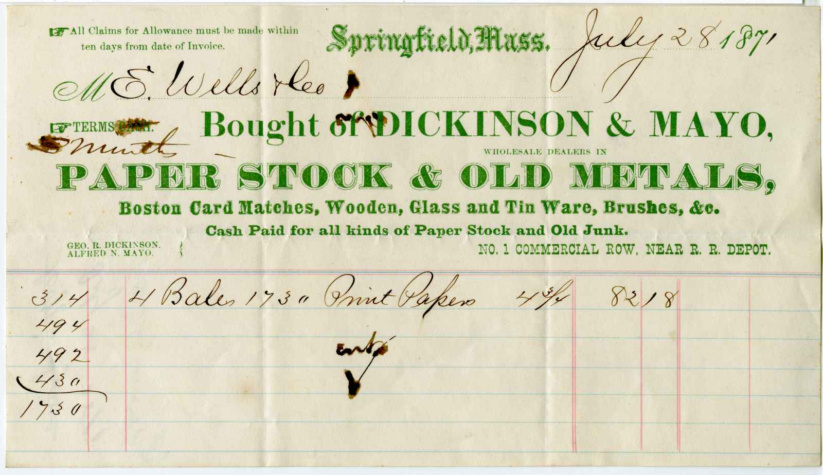 invoice; Dickinson & Mayo - Paper Stock & Old Metals - Springfield, Ma.