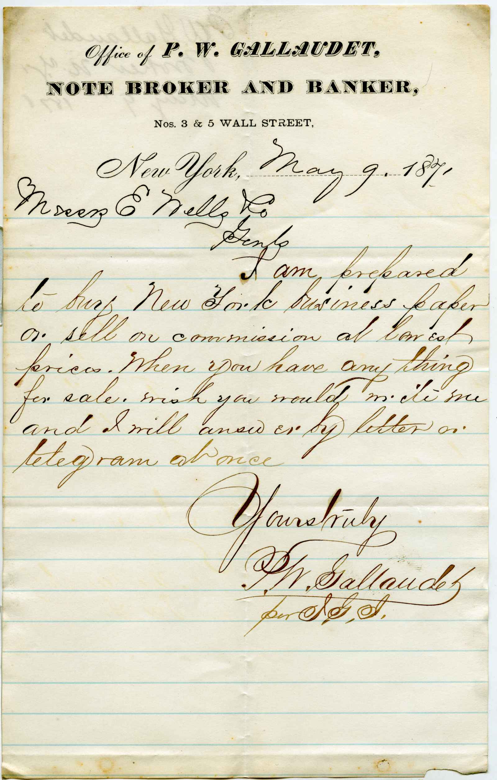 letter; Gallaudet, P.W. - Note Broker & Banker - N.Y.