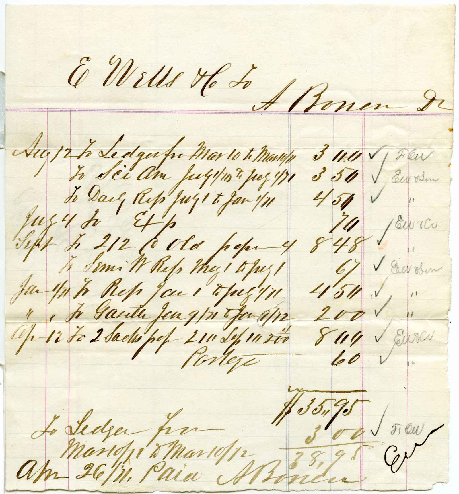 incoming correspondence to the papermaking company of Elisha Wells - circa 1870