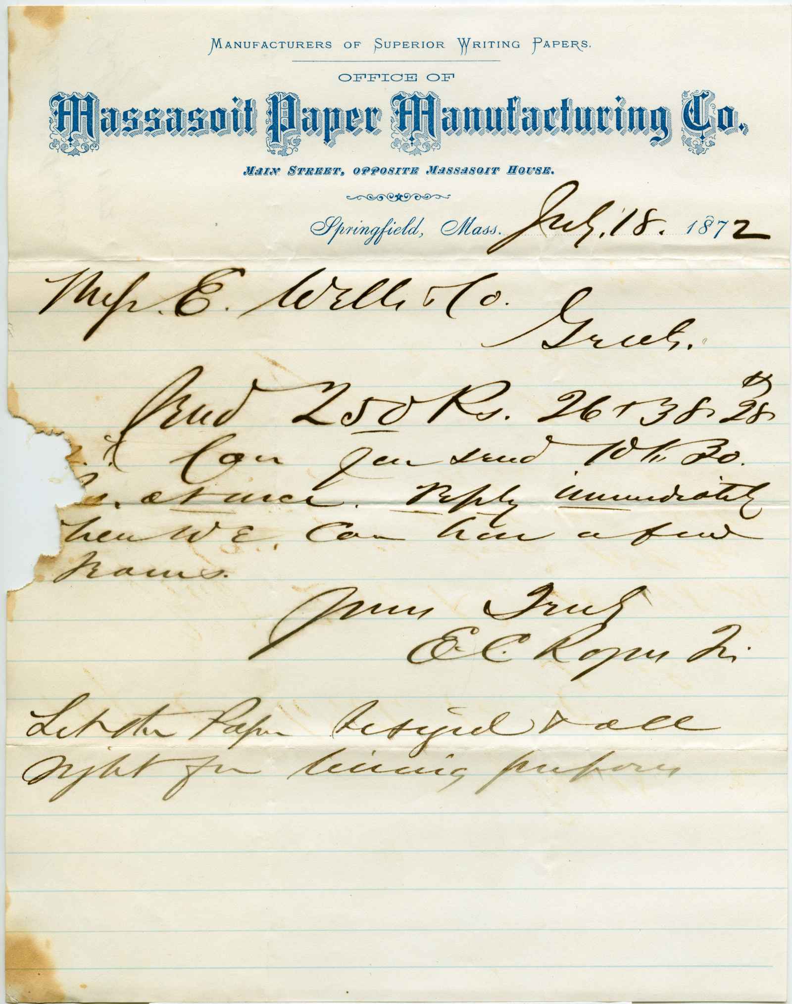letter; Massasoit Paper Manufacturing Co. - Order for paper - Springfield, Ma.