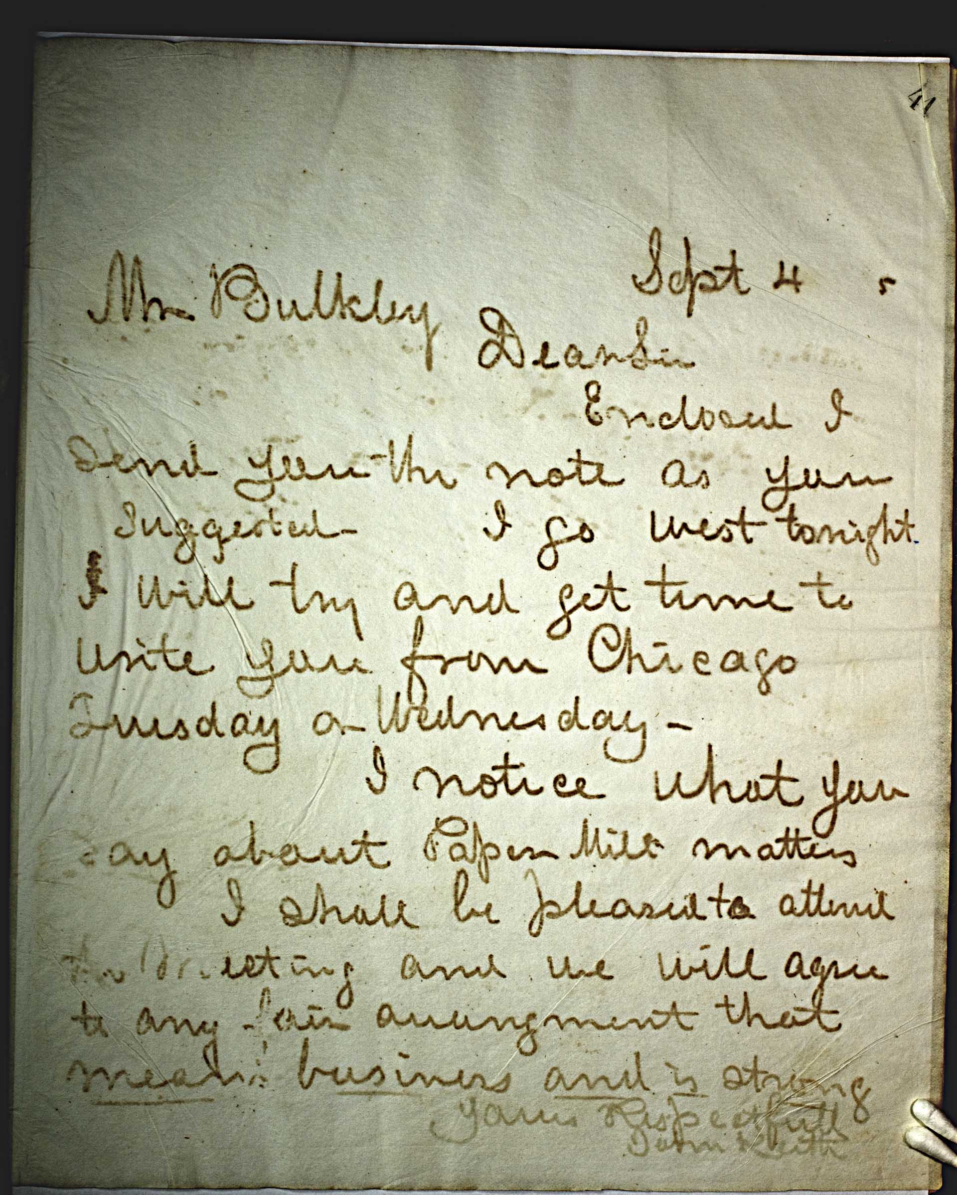 Sept 4 5 [1875] -- Mr. Buckley -- Dear Sir -- Enclosed I send you the note as you suggested – I go west tonight. I will try and get time to write you from Chicago Tuesday or Wednesday – -- I notice what you say about paper mill matters -- I shall be pleased to attend the meeting and we will agree to any fair arrangement that means business and is strong . -- Yours Respectfully -- John Keith --