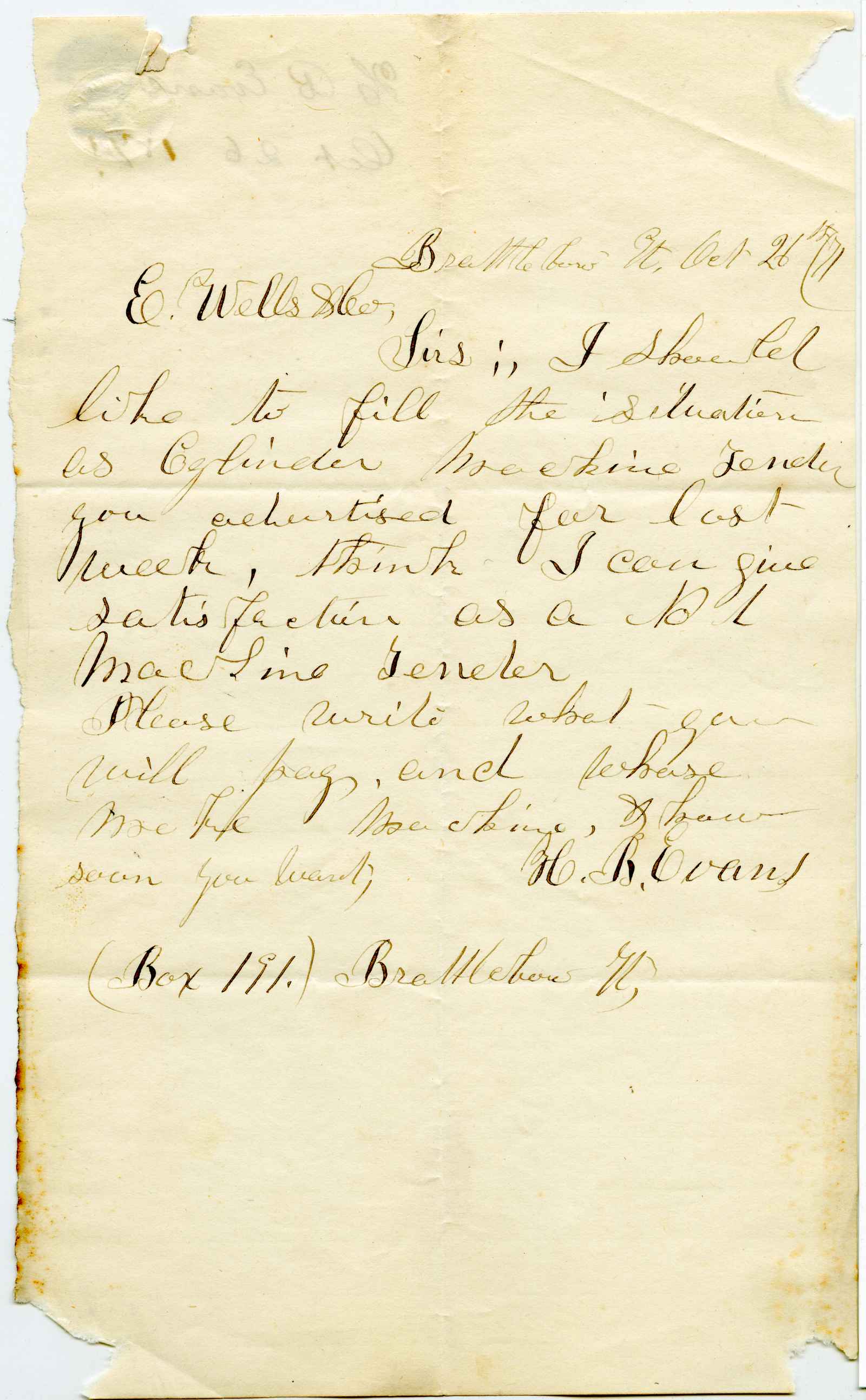 letter; Evans, H. B. - Looking for employment - Brattleboro, Vt.