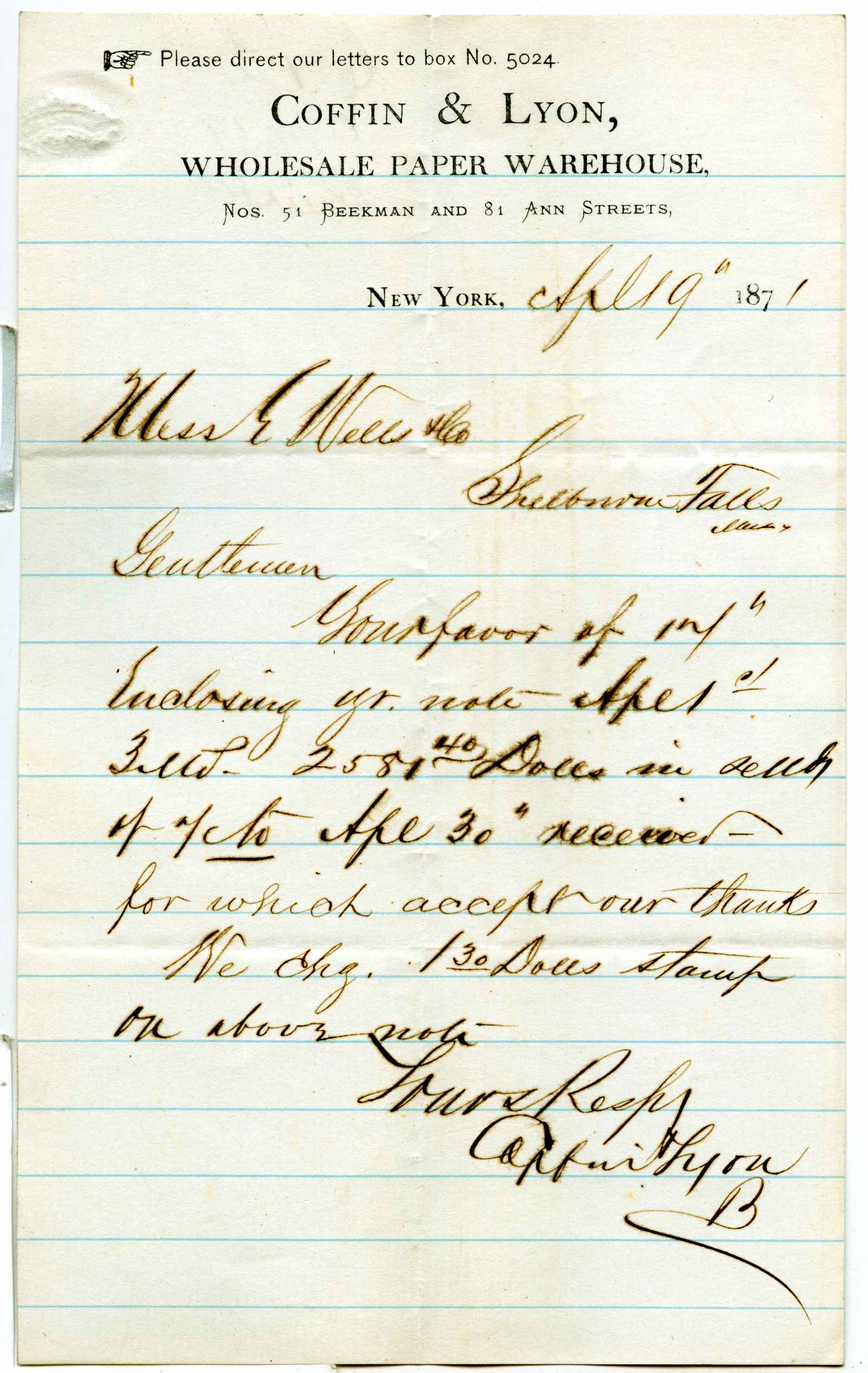 letter; Coffin & Lyon - Wholesale Paper Warehouse - N.Y.