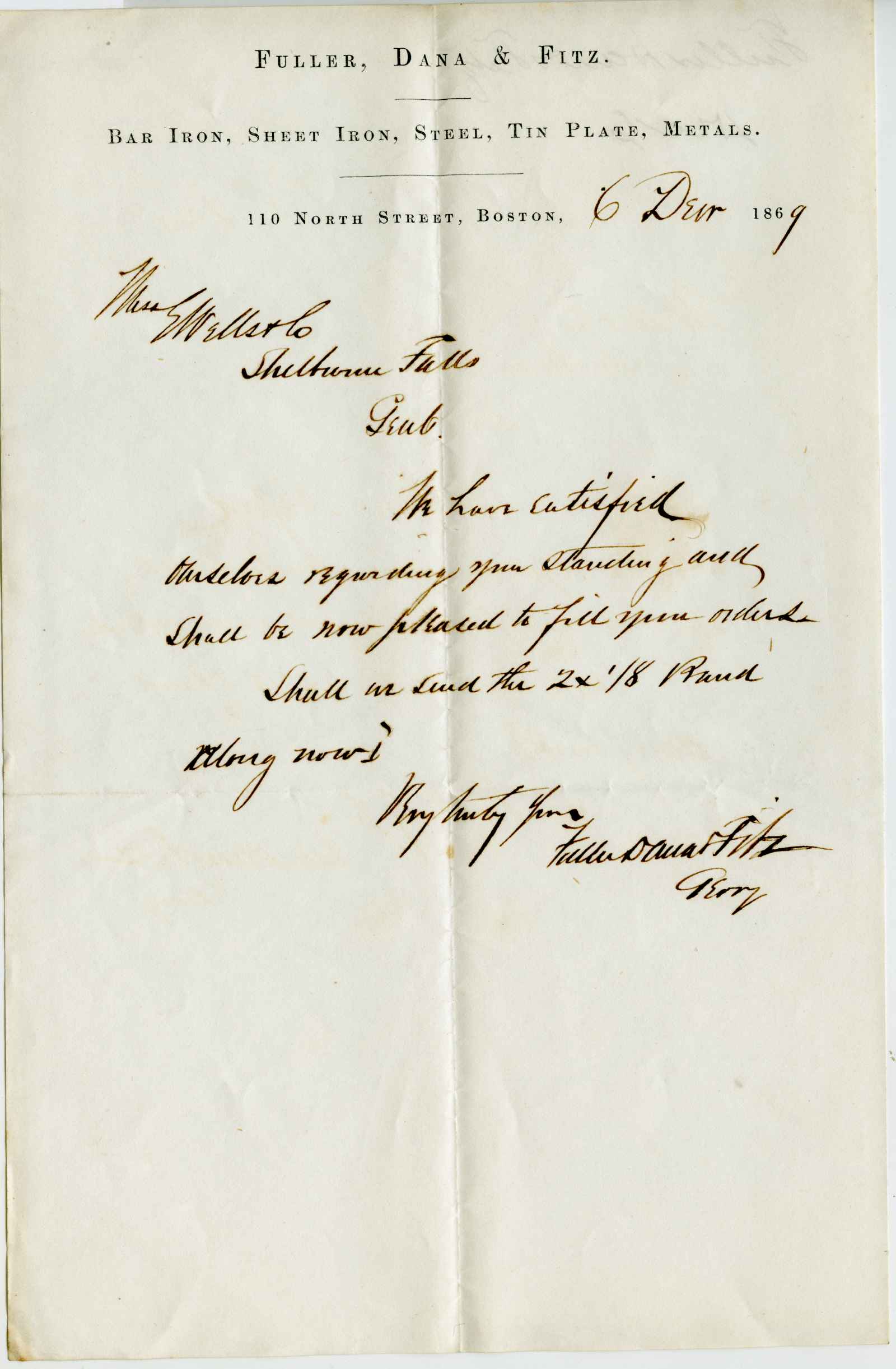 letter; Fuller, Dana & Fitz - Bar Iron, Sheet Iron, Steel, Tin Plate, Metals - Boston