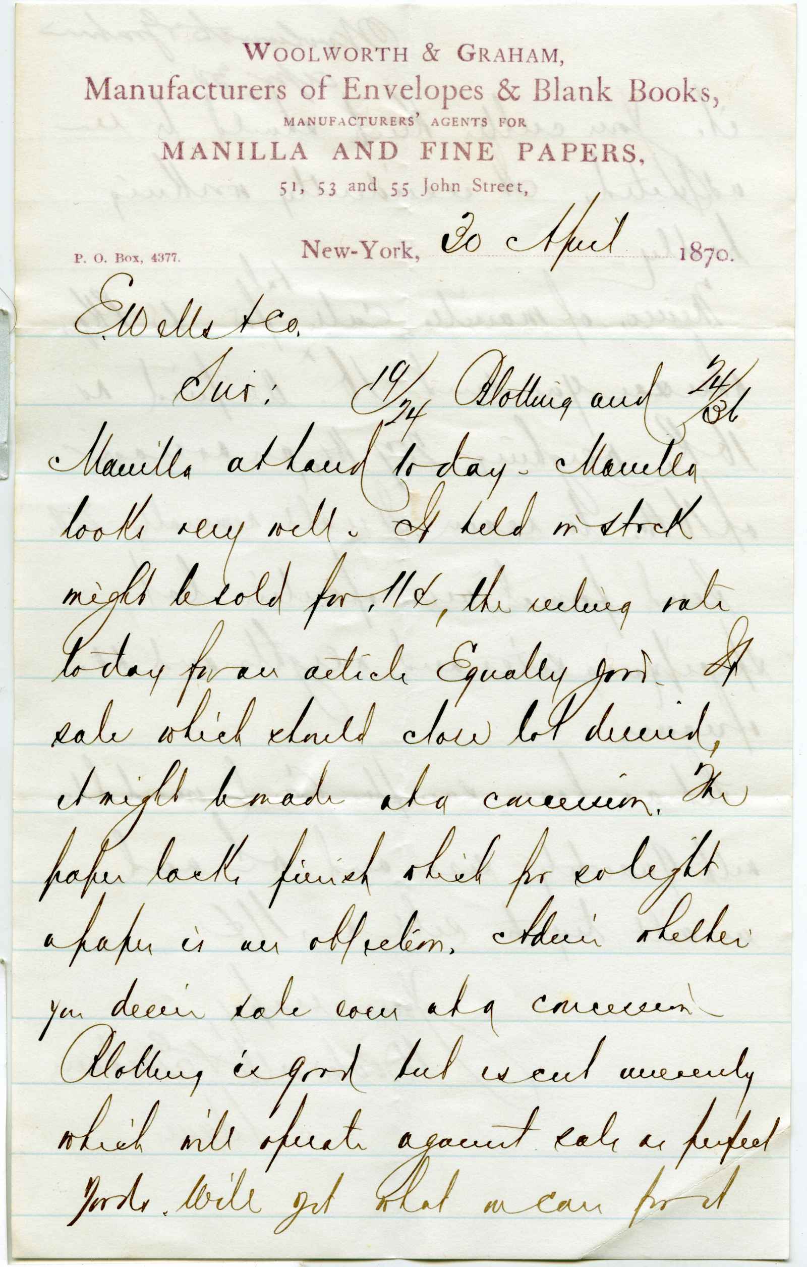 incoming correspondence to the papermaking company of Elisha Wells - circa 1870