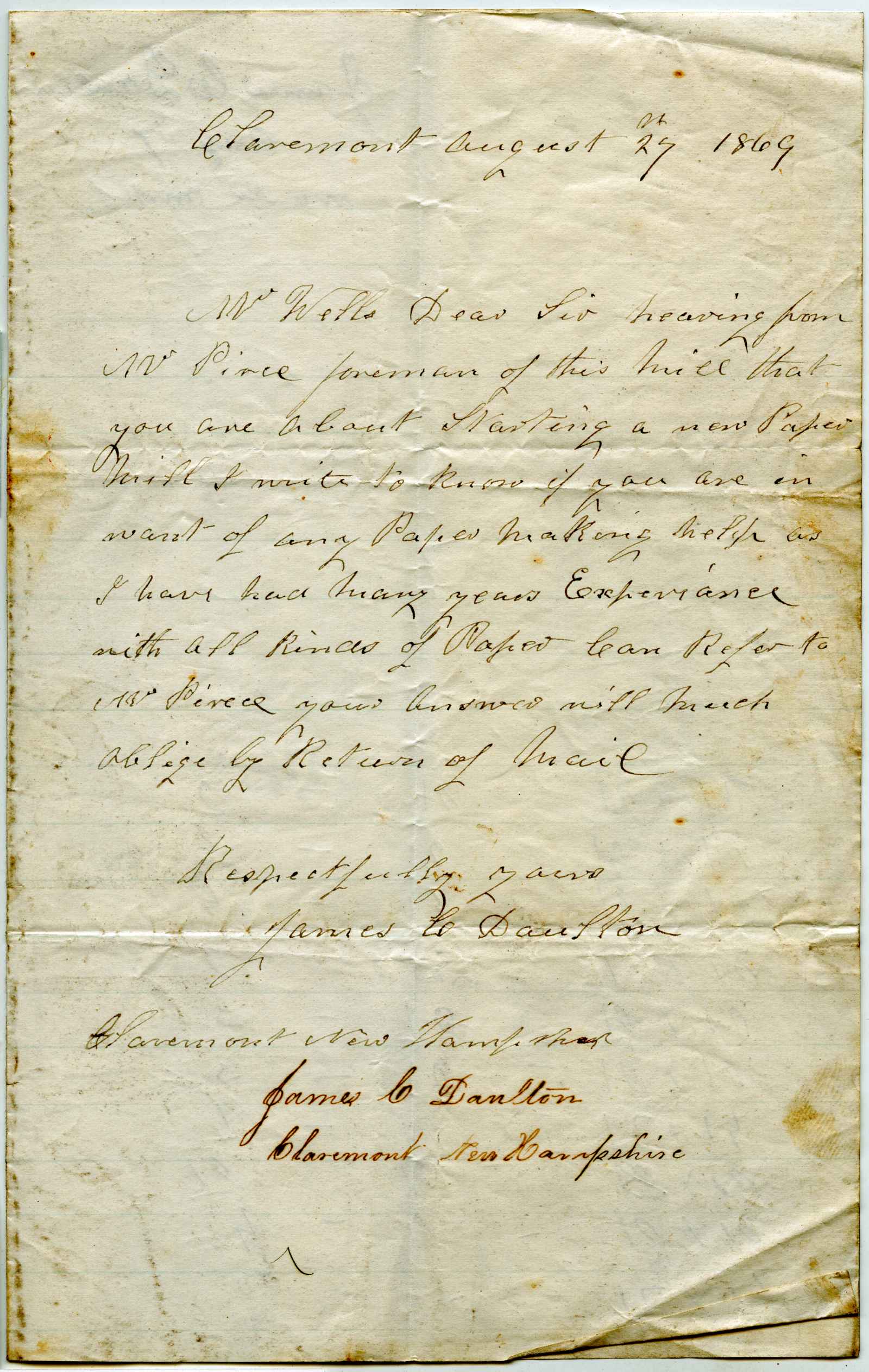 letter; Danlton, James, C. - Looking for employment - Charlemont, Ma.
