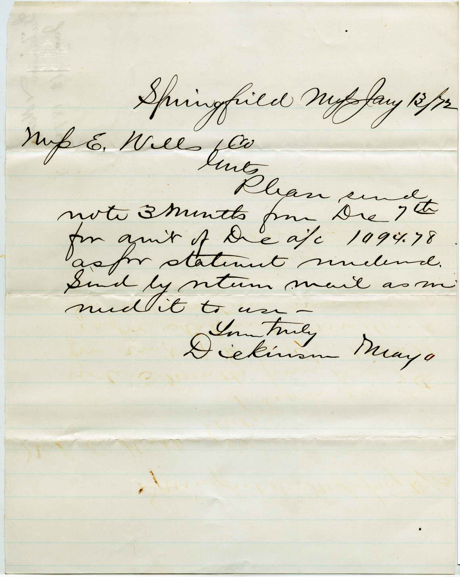 letter; Dickinson & Mayo - Paper Stock & Old Metals - Springfield, Ma.