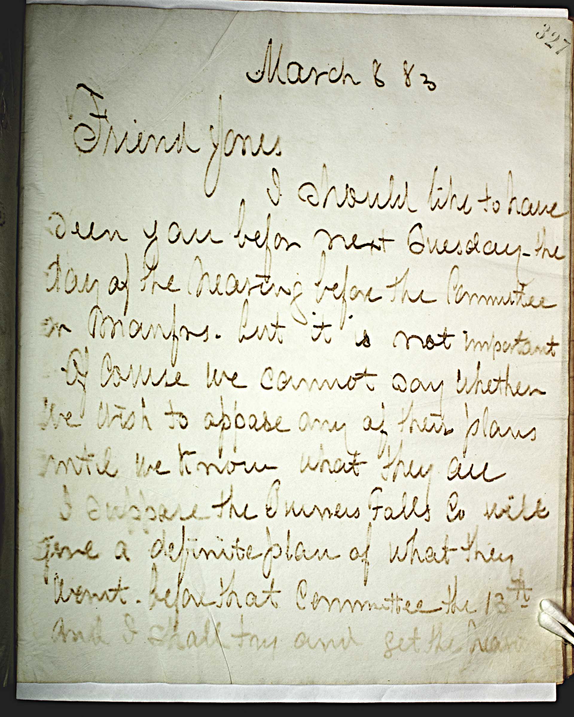 March 8, 83 [1883] -- Friend Jones, -- I should like to have seen you before next Tuesday-the day of the hearing before the committee on manfrs. but it is not important. -- Of course we cannot say whether we wish to oppose any of their plans until we know what they are -- I suppose the Turners Falls Co. will have a definite plan of what they want before that committee the 13th and I shall try and get the hearing -- --