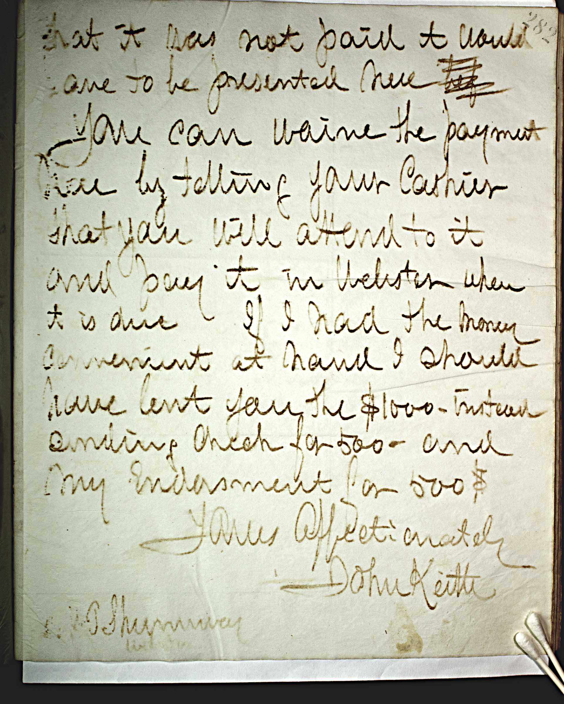 that it was not paid it would have to be presented here her. -- You can waive the payment here by telling your Cashier that you will attend to it and pay it in Webster when it is due. If I had the money convenient at hand I should have lent you the $1000 — instead sending check for 500 - and my endorsement for $500. -- Yours Affectionately -- John Keith -- J. T. Shumway, Webster --