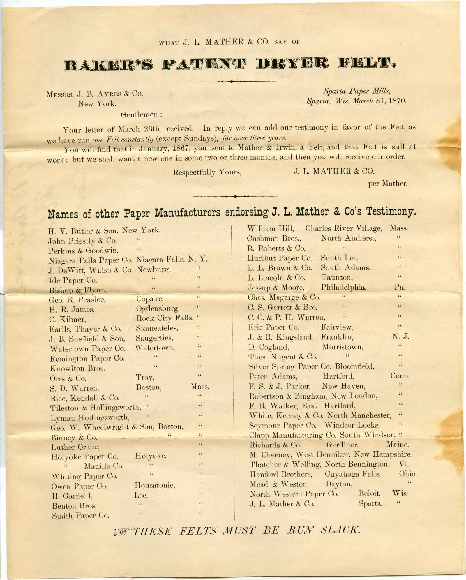 incoming correspondence to the papermaking company of Elisha Wells - circa 1870