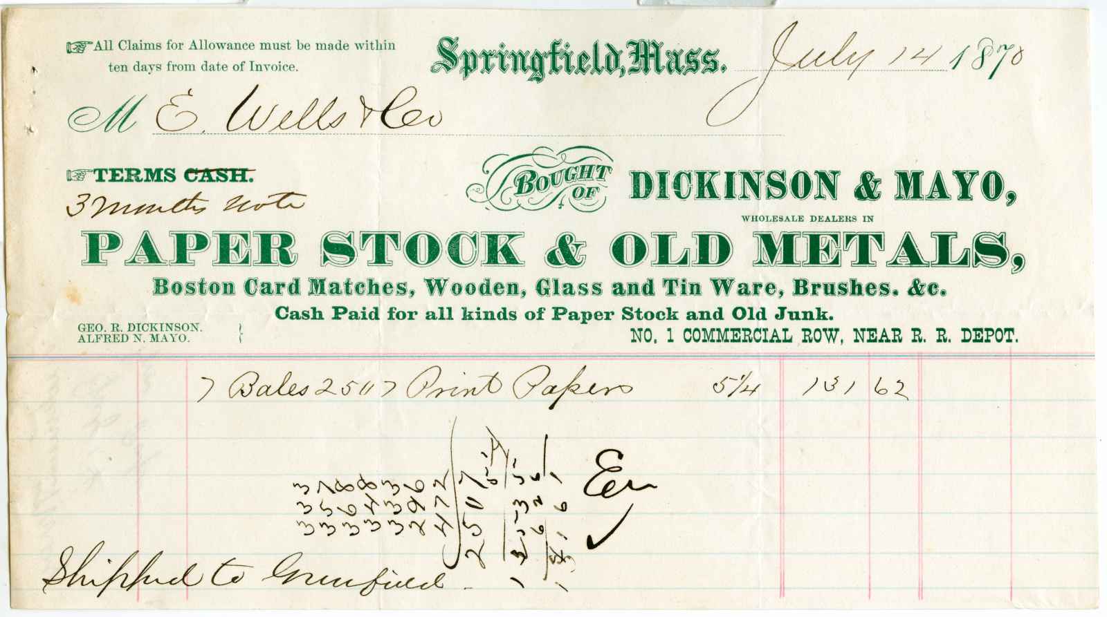 invoice; Dickinson & Mayo - Paper Stock & Old Metals - Springfield, Ma.