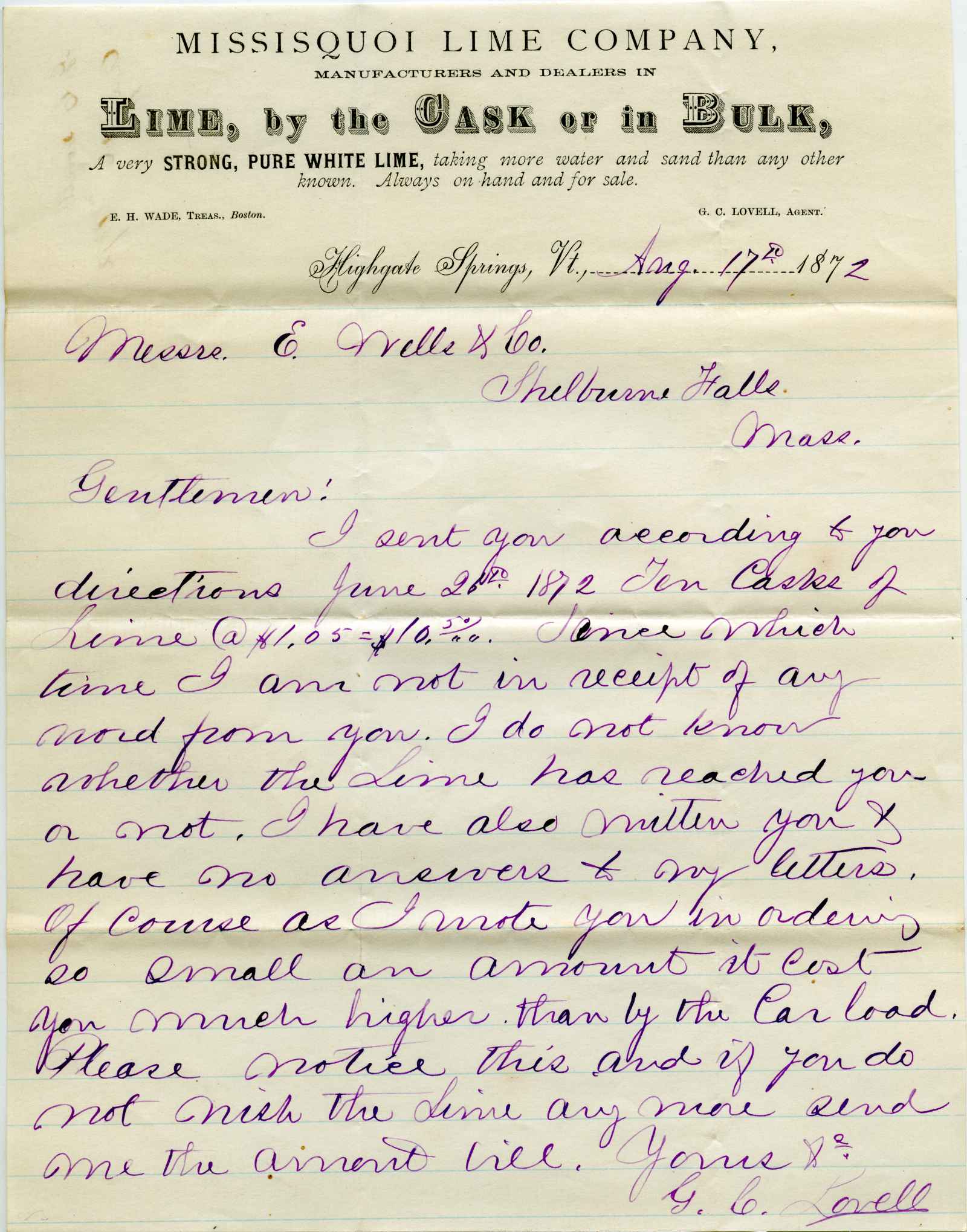 | dc.description | letter; Missisqoi Lime Co. - €” Lime - Highgate Springs, Vt. | |