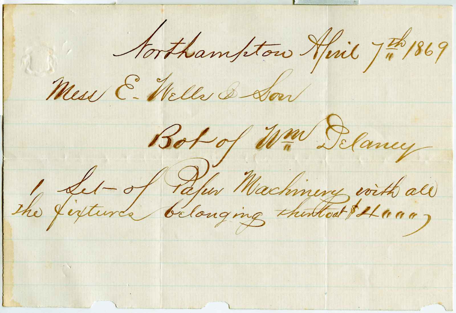 letter; Delaney, William - Machinery Sales - Northampton, Ma.