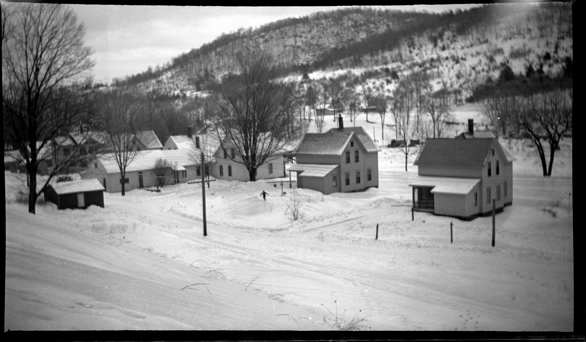 Houses along Rte.112 south of Colrain center. A youngster has built a small ice skating rink in his front yard. c1939
