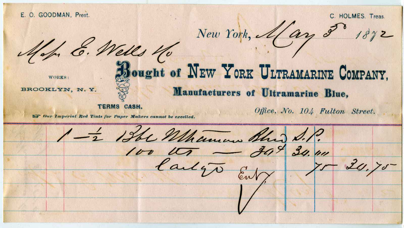 invoice; New York Ultramarine Company - Manufacturers of Ultramarine Blue - N.Y.