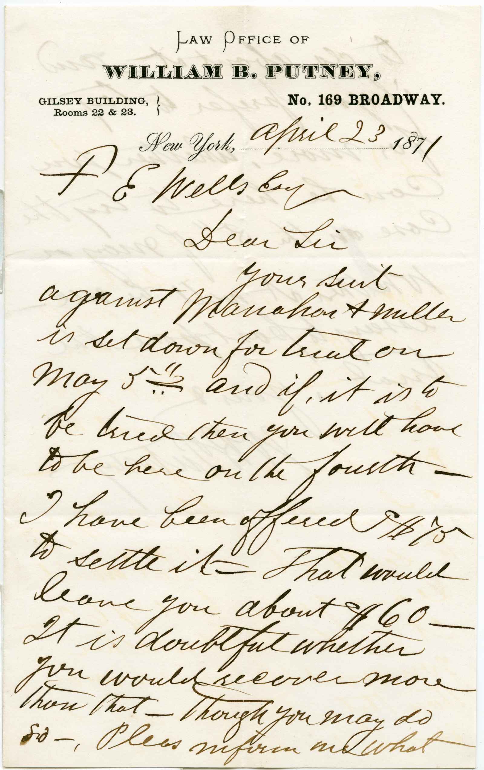 incoming correspondence to the papermaking company of Elisha Wells - circa 1870