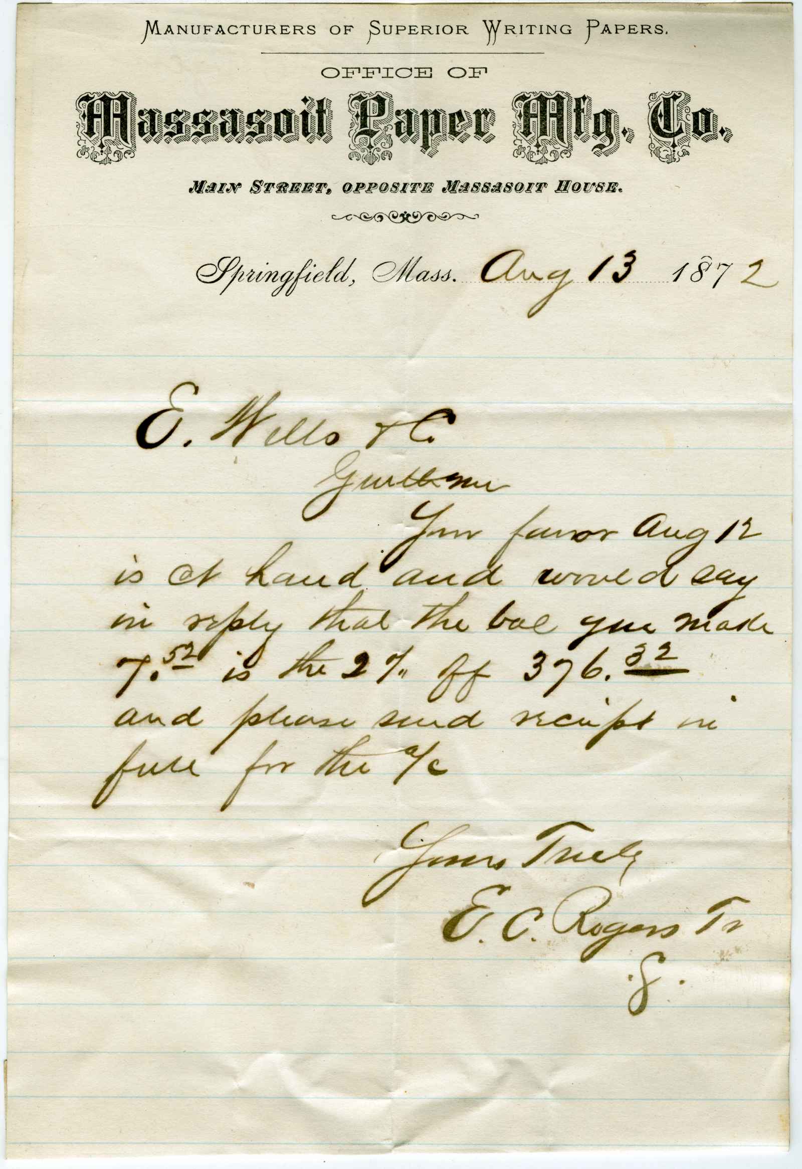 | dc.description.abstract | incoming correspondence to the papermaking company of Elisha Wells - circa 1870 | |