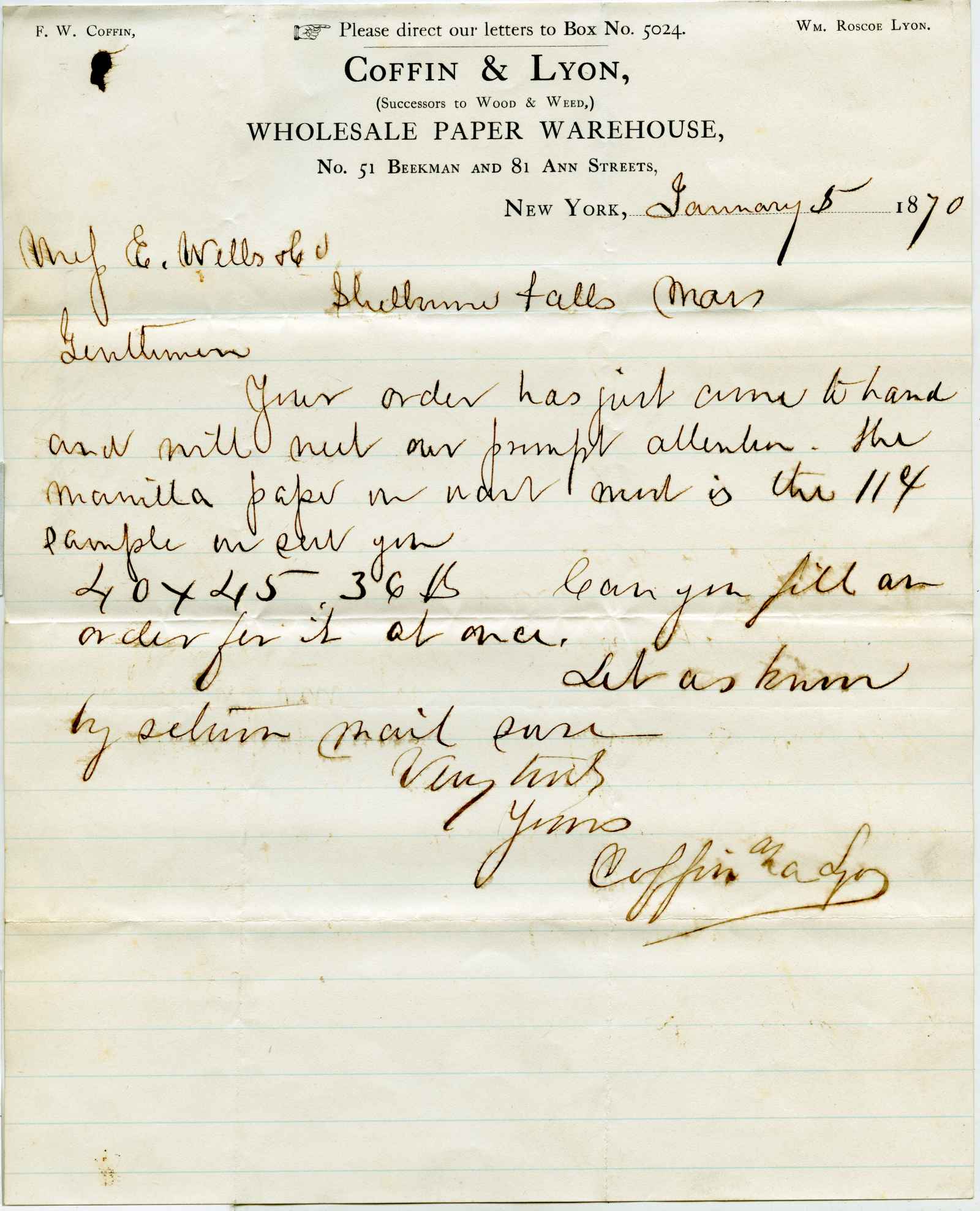 letter; Coffin & Lyon - Wholesale Paper Warehouse - N. Y.