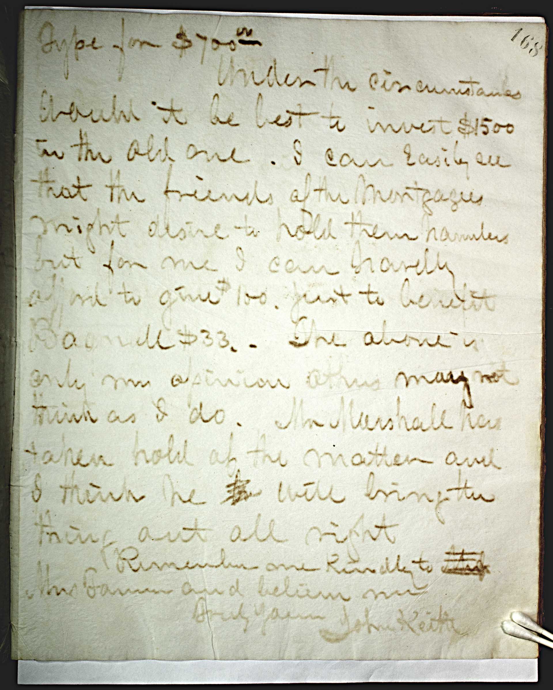 type for $700.00 -- Under the circumstances wouldn't it be best to invest $1500 in the old one. I can Easily see that the friends of the Montagues might desire to hold them harmless but for me I can hardly afford to give $100.00 just to benefit Bagnall $33. - The above is only my opinion others may not think as I do. Mr. Marshall has taken hold of the matter and I think he will bring the thing out all right. -- Remember one Kindly to Mrs. Farren and believe me. Truly Yours John Keith -- ; -- Cecil Bagnall was editor of the Turners Falls Reporter (local newspaper) from 1876 to 1922. -- e.g. --