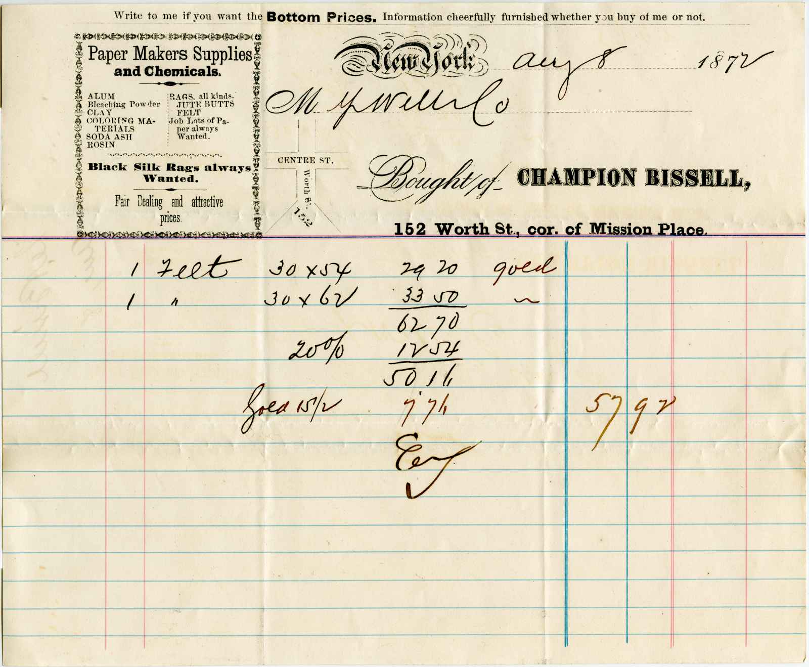 invoice; Bissell, Champion - Paper Maker Supplies and Chemicals 152 Worth St. N.Y.