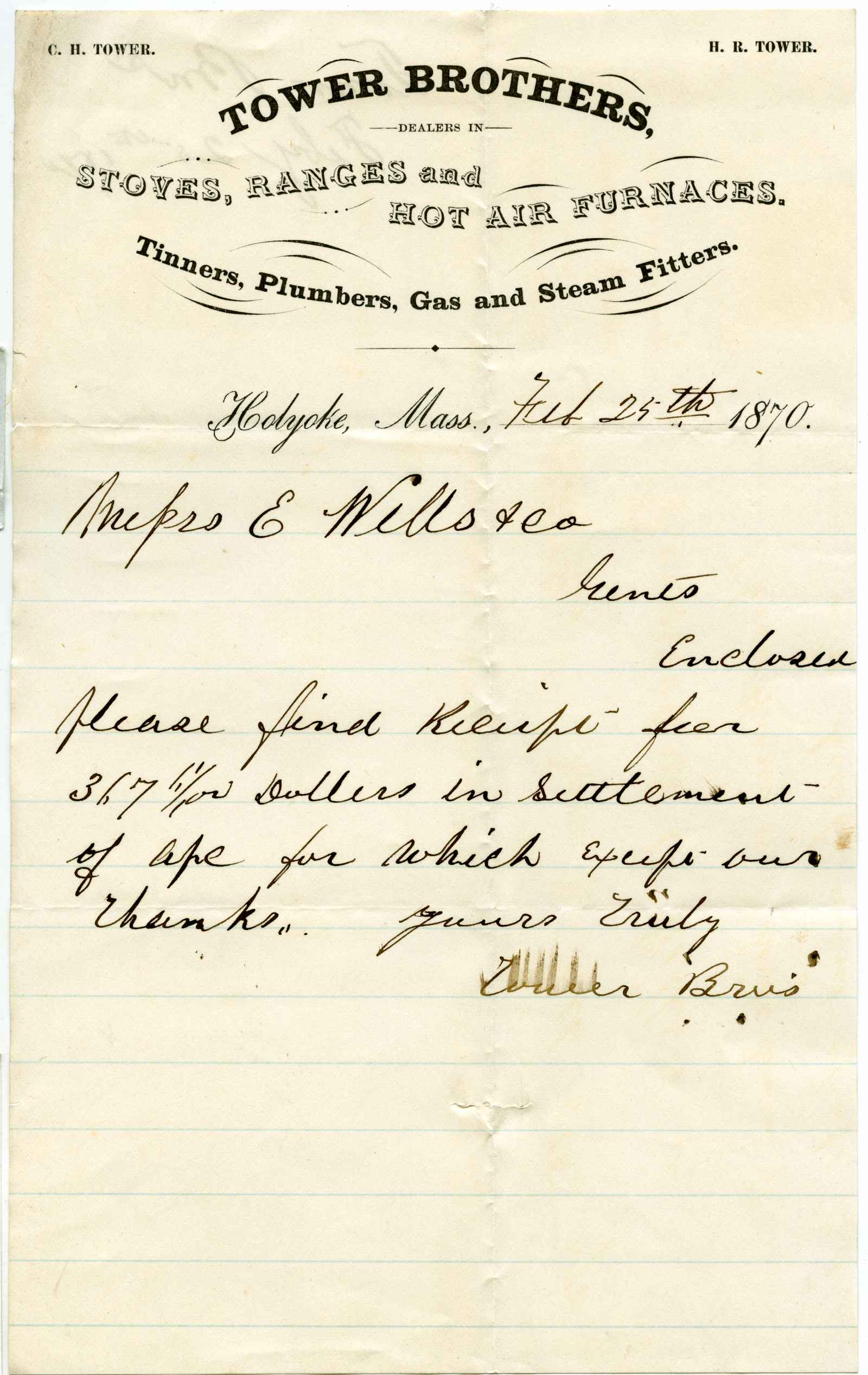 letter; Tower Bros. - Stoves, Hot Air Furnaces, House Finishing Goods - Holyoke, Ma.