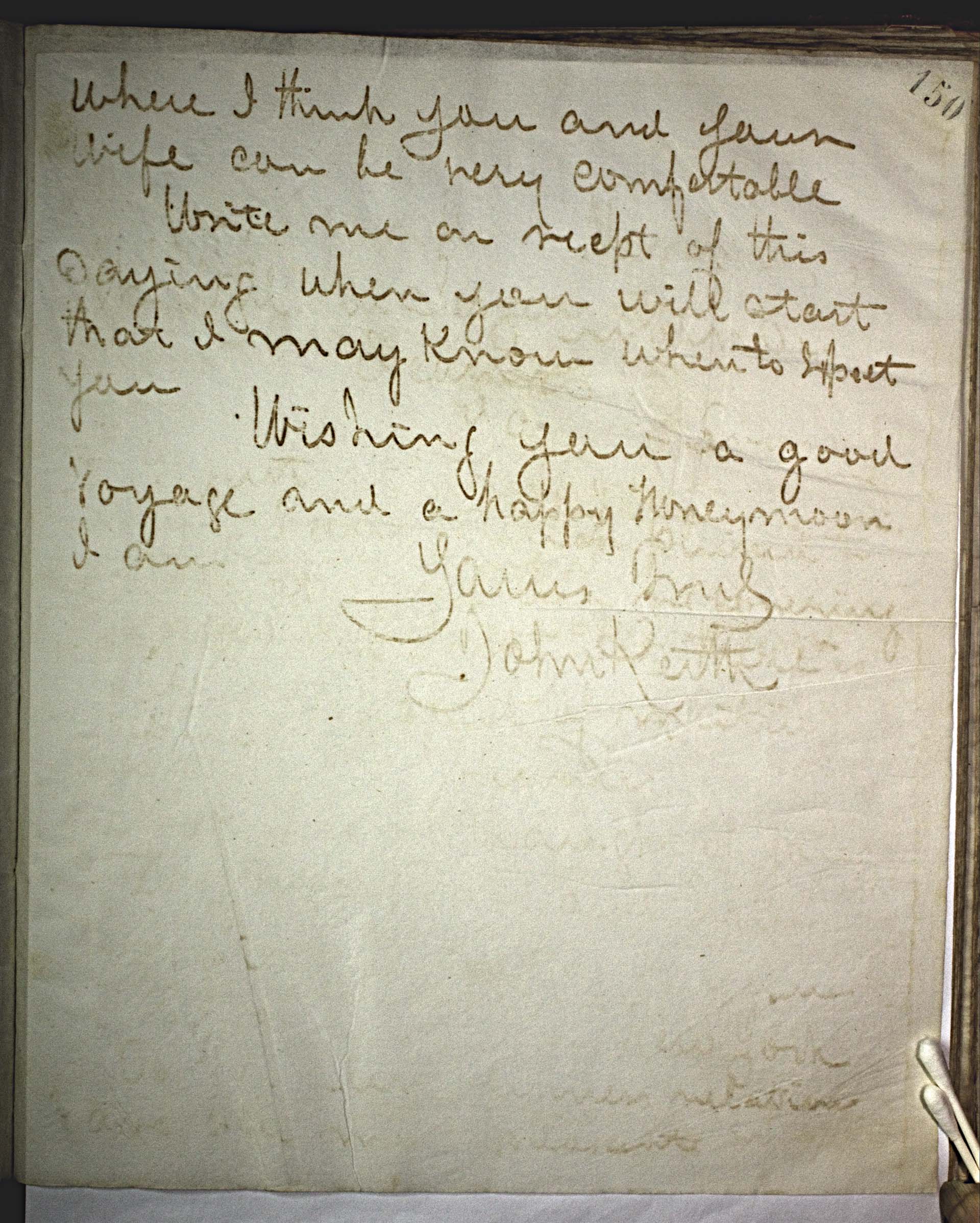 where I think you and your wife can be very comfortable. -- Write me on receipt of this saying when you will start that I may know when to expect you. -- Wishing you a good voyage and a happy honeymoon. -- I am Yours Truly -- John Keith --