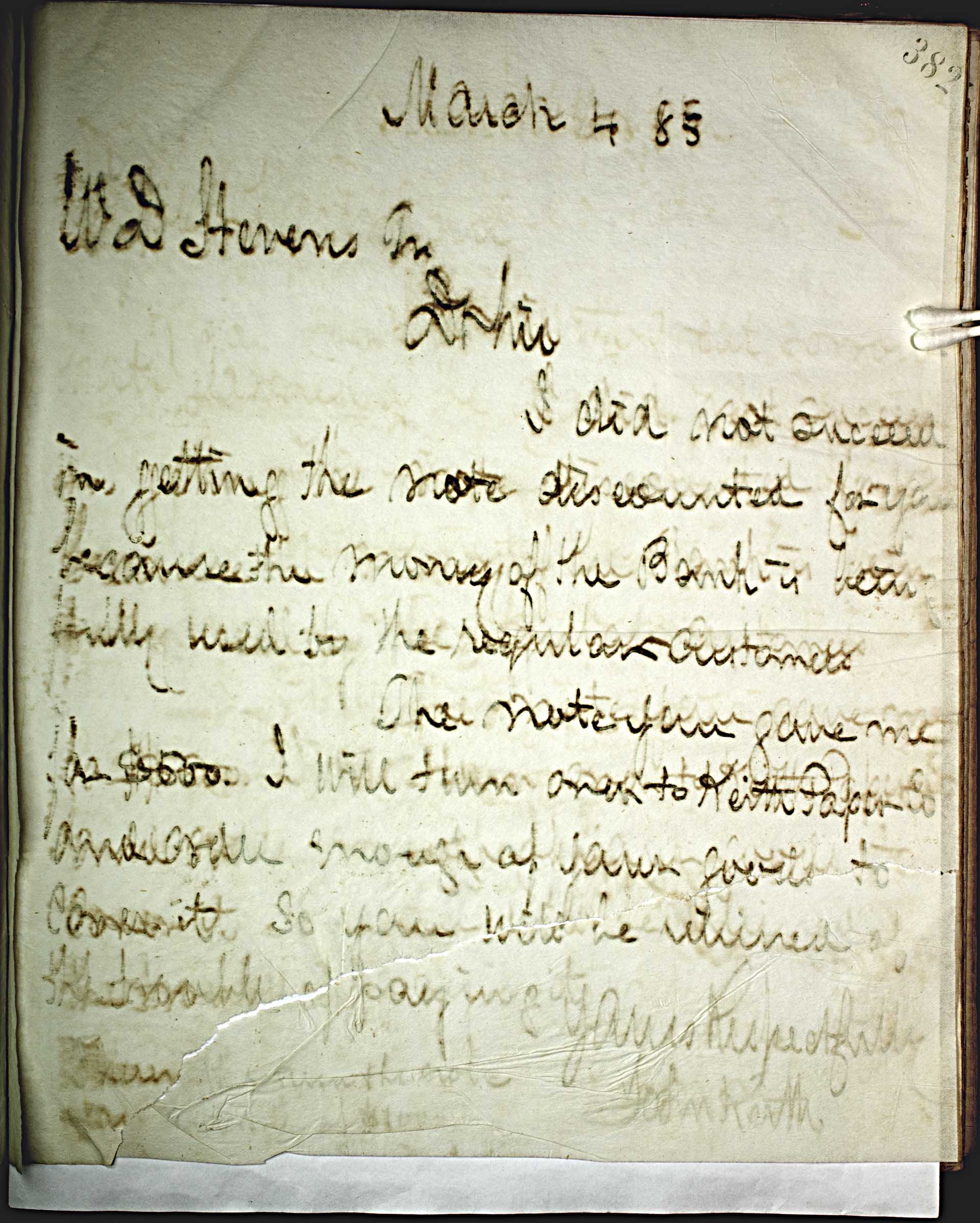 March 4, 85 [1885] -- W. D. Stevens Co. -- Dr Sir, -- I did not succeed in getting the note discounted for you because many of the banks [possibly] used to be the regular customers. -- The note you gave me has $5000. I will turn over to Keith Paper Co. and order enough of your goods to convert it. So you will be relieved of the trouble of paying it. -- Yours Respectfully -- John Keith -- -- The note in the lower-left corner, -- if part of this letter, is illegible. -- e.g. -- -- -- --