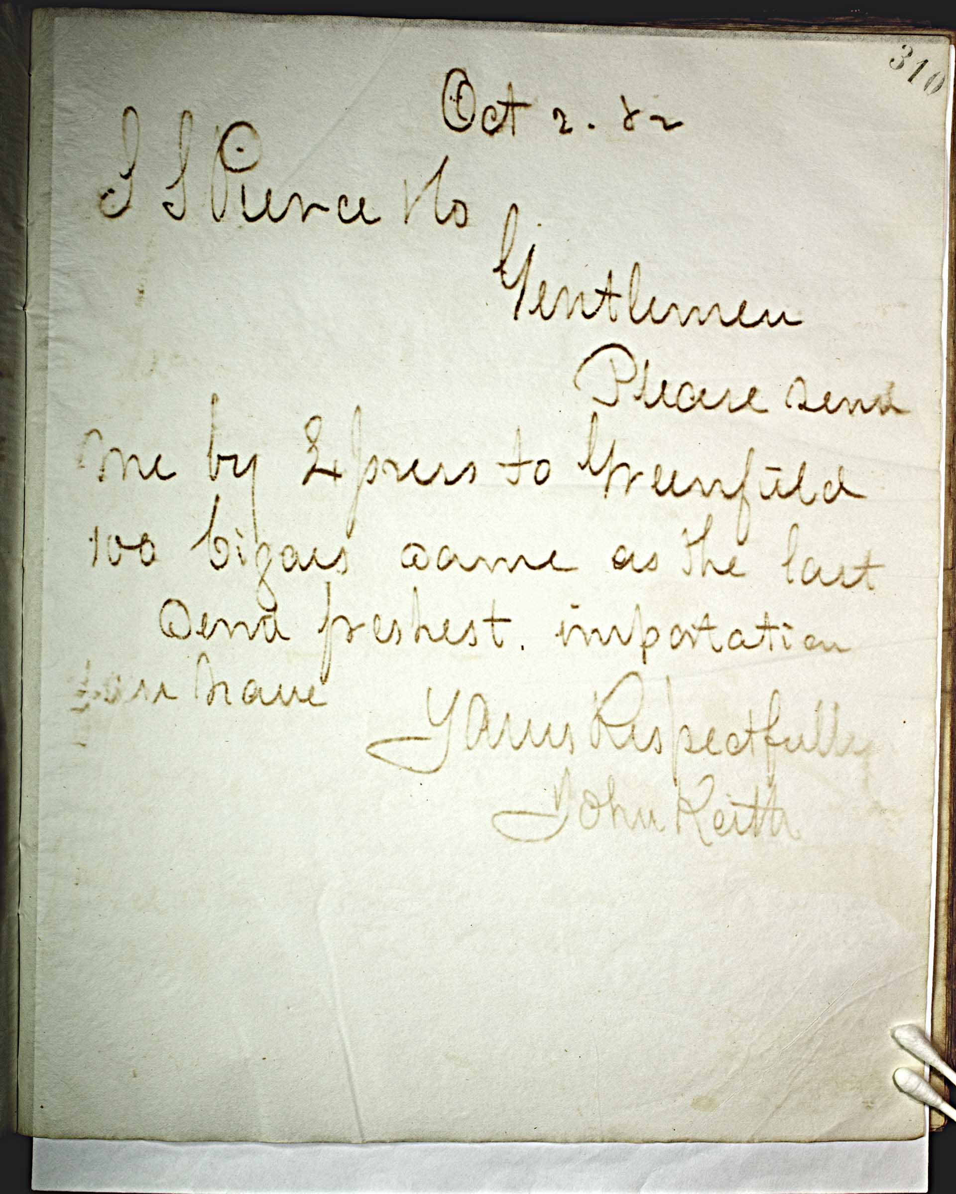 Oct 2, 82 [1882] -- -- S.S. Pierce Co. -- Gentlemen, -- Please send me by Express to Greenfield 100 cigars same as the last. -- Send freshest importation you have. -- Yours Respectfully -- John Keith --