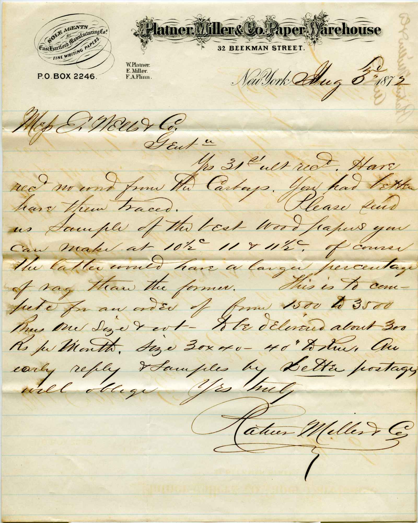letter; Platner, Miller & Co. - Paper Warehouse, Business letter - N.Y.