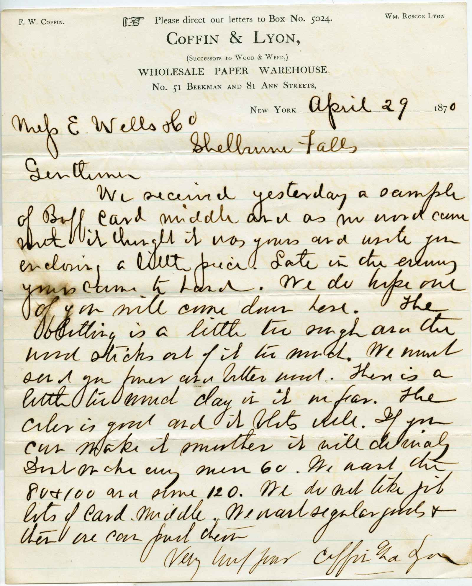 letter; Coffin & Lyon - Wholesale Paper Warehouse - N. Y.