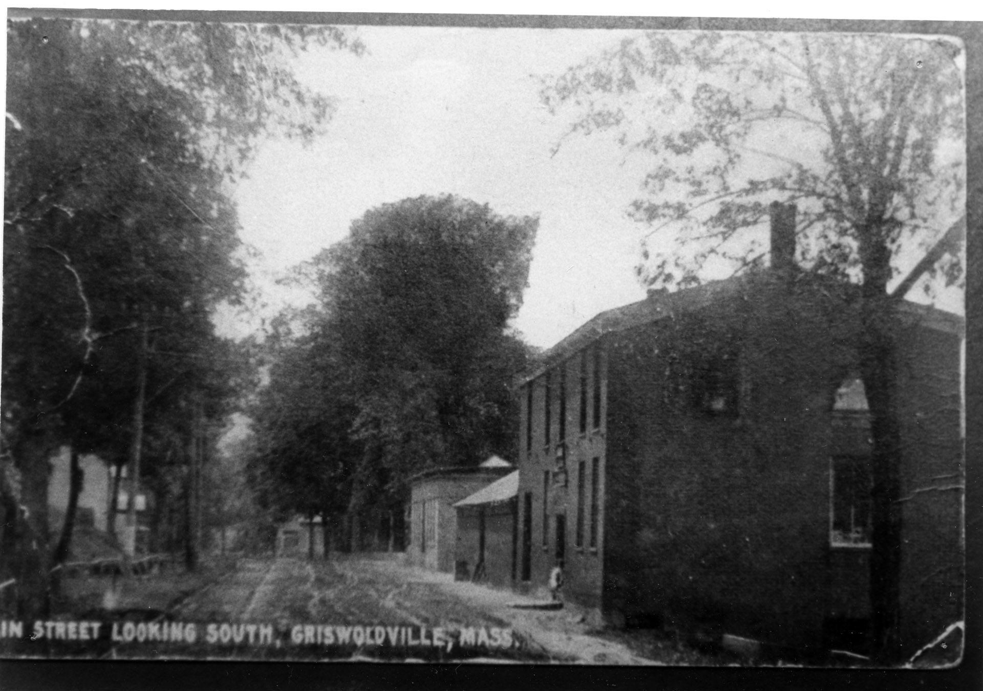 Griswoldville Main Street looking south (store on right); - There was no Griswoldville when Joseph settled on the North River. But there had been manufacturing in the town. In 1795 Capt. Edward Adams had started a fulling mill at the location later called Adamsville. And as early as 1814 Warren P. King, Isaac Johnson and others had begun the manufacture of cotton goods at what in now Shattuckville. Other industries included Lyons' Furniture shop at Lyonsville, Willis' Foundry, and various smaller ventures.- In this town, then, Joseph Griswold came and settled. "They commenced their married life in a house at Griswoldville, now standing, which he had erected with his own hands."* The shop also he built himself. One story says he laid seven thousand shingles in one day on his barn.