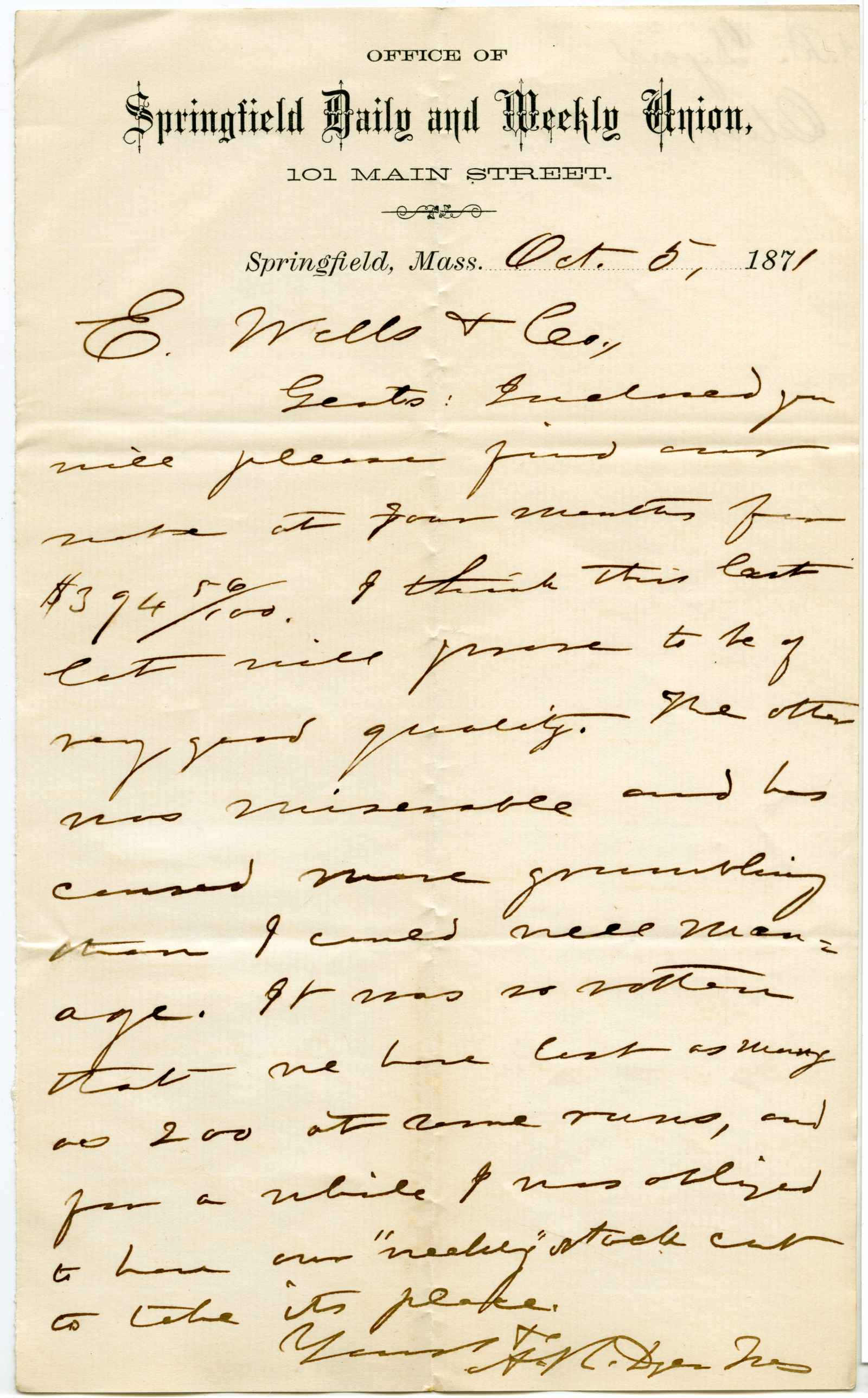 letter; Springfield Daily and Weekly Union - Newspaper - Springfield, Ma.