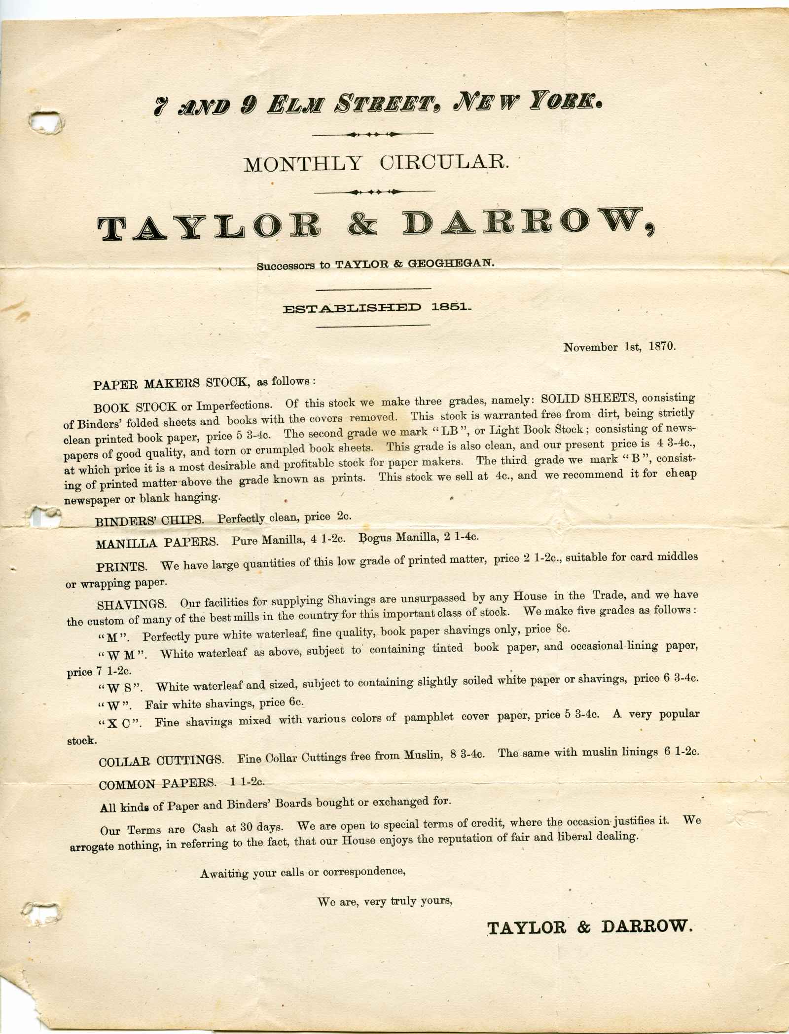 Taylor & Darrow - Paper makers stock - N. Y.C.