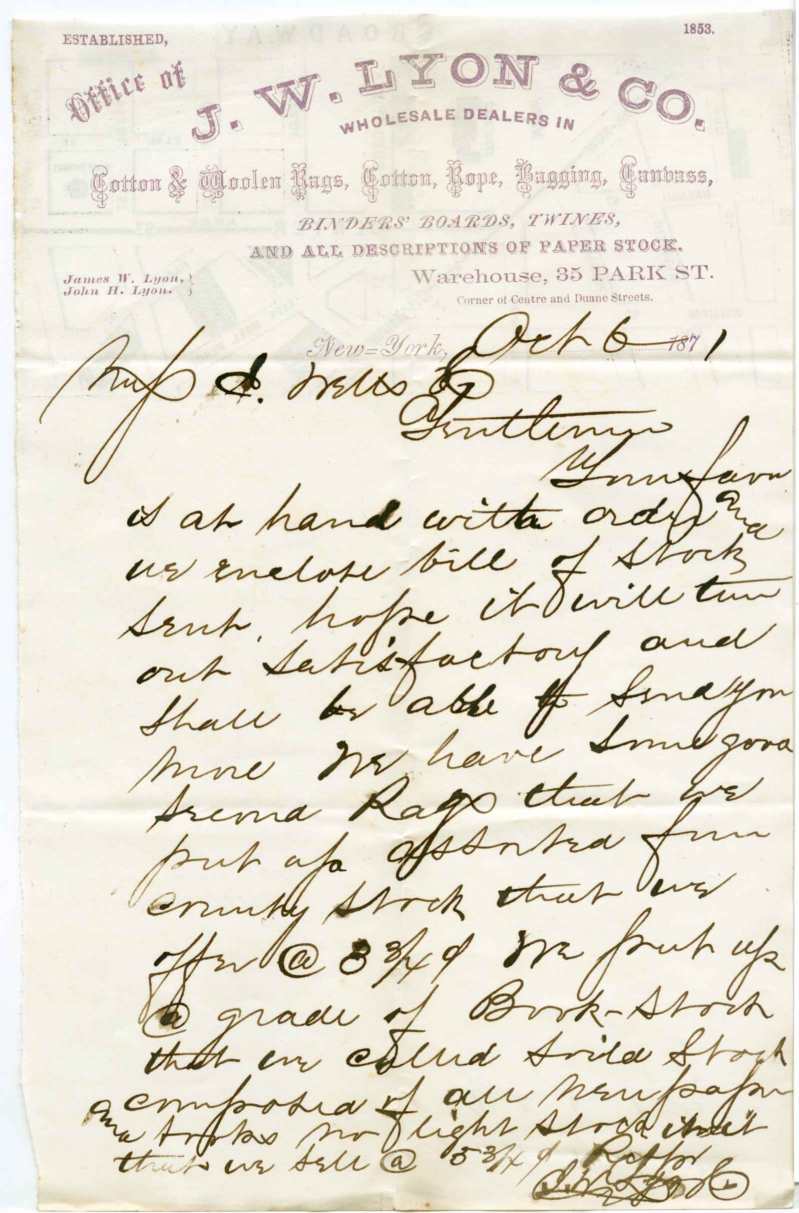letter; Lyon, J. W. & Co. - Cotton & Woolen Rags, Rope, Bagging, Canvas - N.Y.