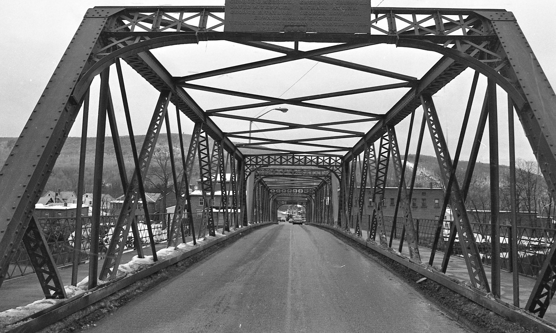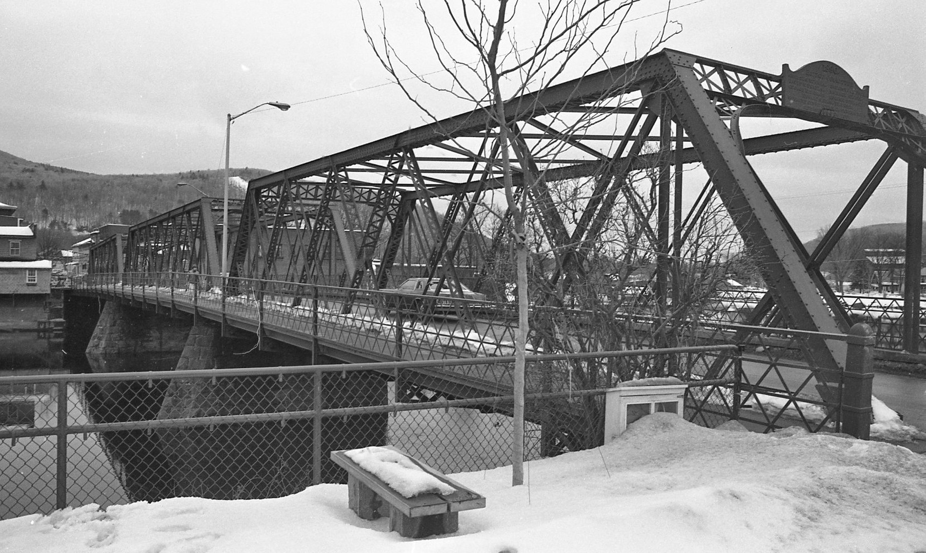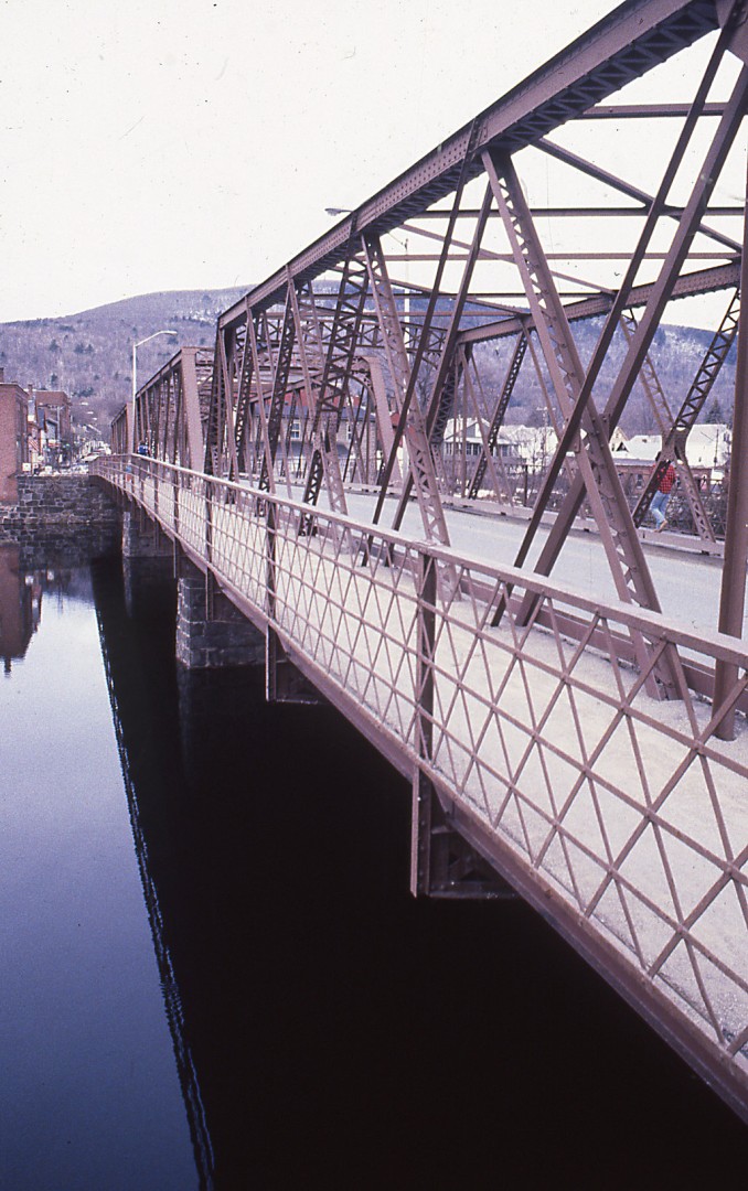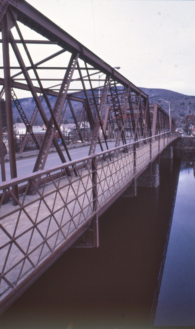 Length of largest span: 102.7 ft.; Total length: 316.0 ft.; Deck width: 20.0 ft. Vertical clearance above deck: 11.1 ft. Built by R.F. Hawkins Ironworks, Fabricators, Springfield, MA. The Vermont Construction Co. of St. Albans, VT are the contractors. The bridge is rehabilitated in 1992-94.