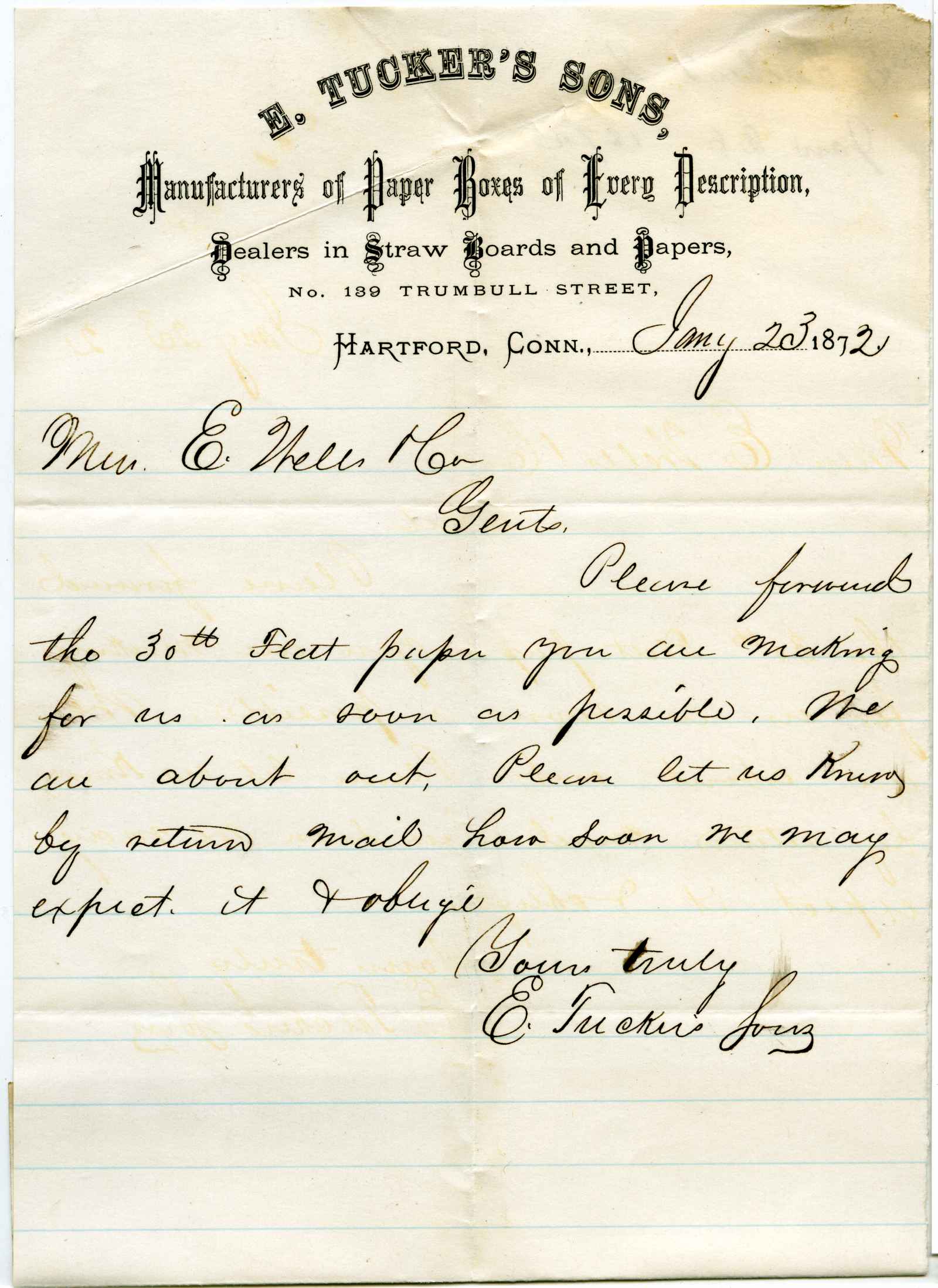 letter; Tucker, E. & Sons - Manufacturers of Paper Boxes - Hartford, Ct.