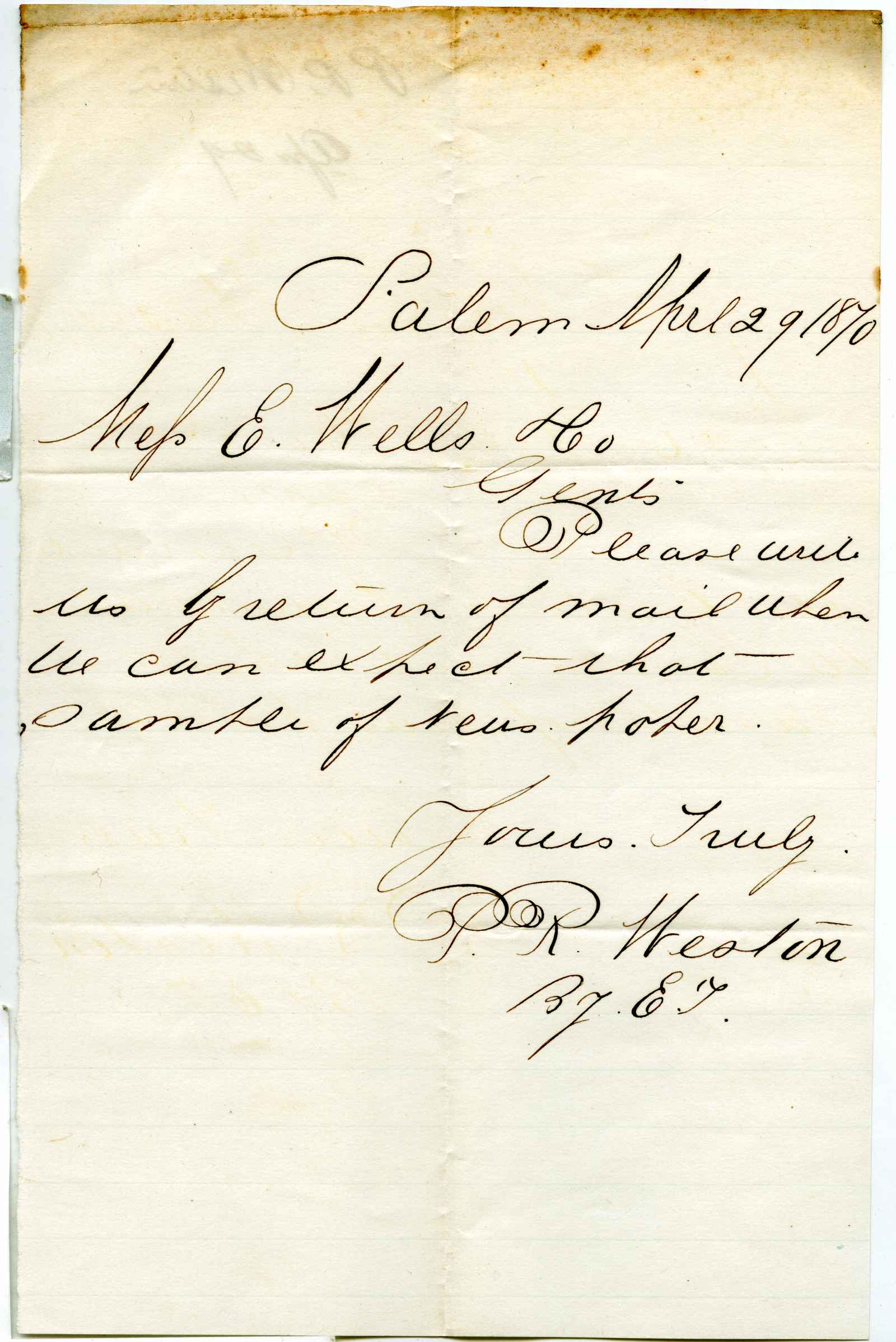 letter; Weston, O. R. - Request for specialty papers - Salem, Ma.