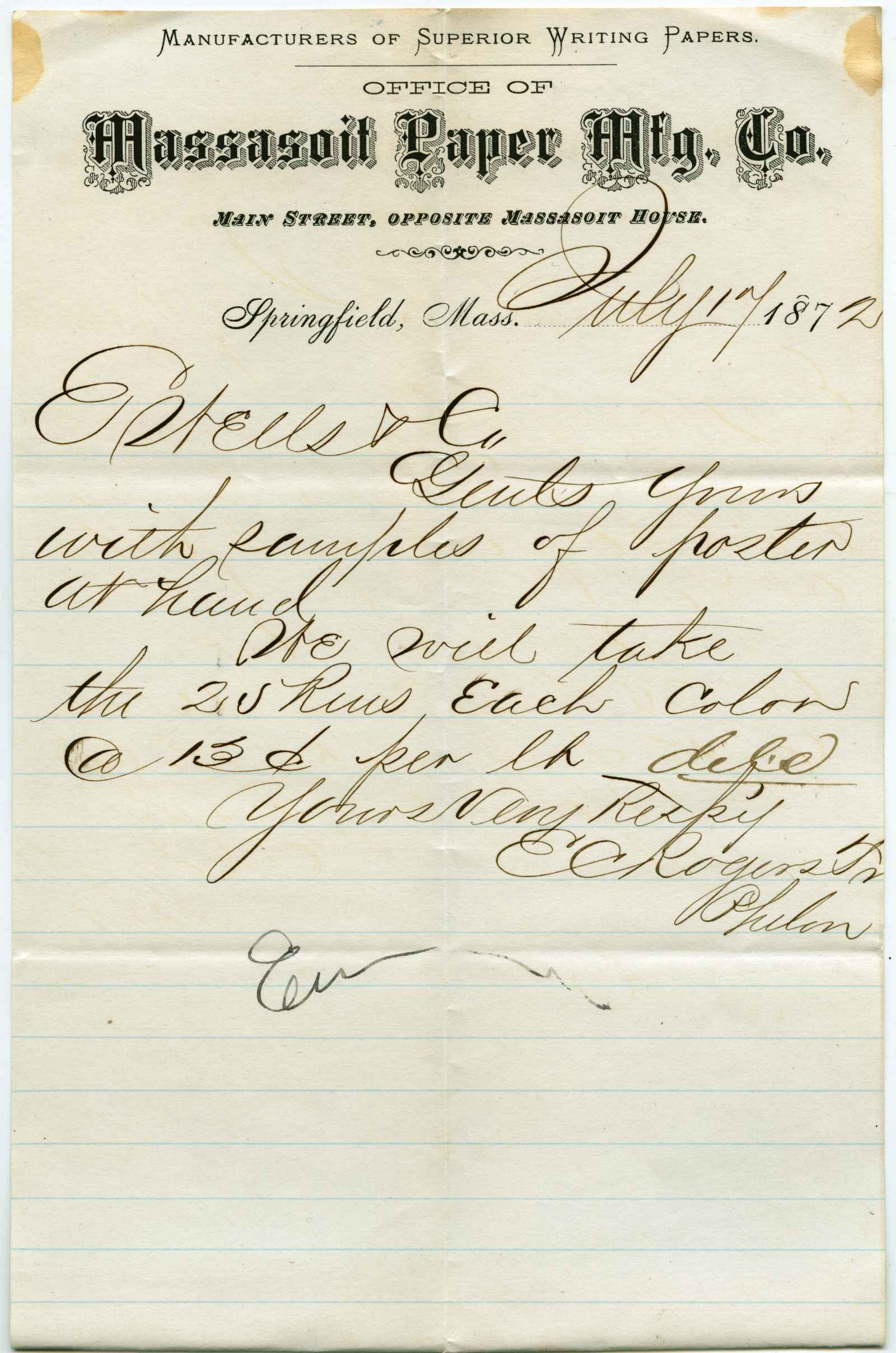letter; Massasoit Paper Manufacturing Co. - Order for paper - Springfield, Ma.