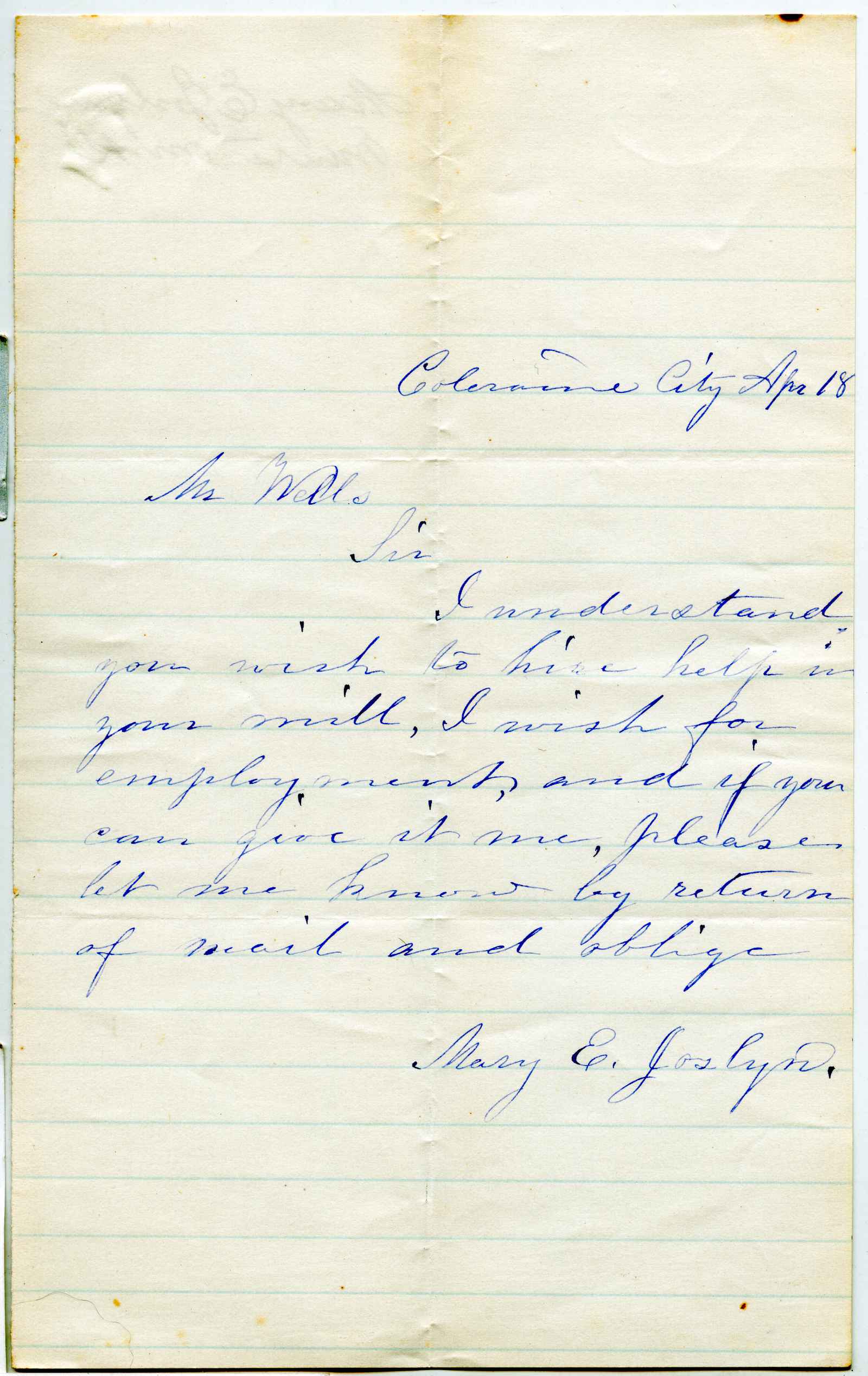 letter; Joslyn, Mary E. - Looking for employment - Coleraine City, Ma.