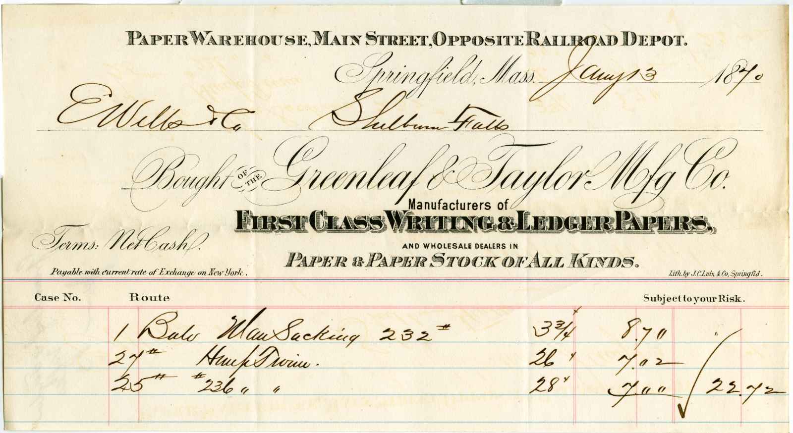 invoice; Greenleaf & Taylor Mfg. Co. - Paper Warehouse - Springfield, Ma.