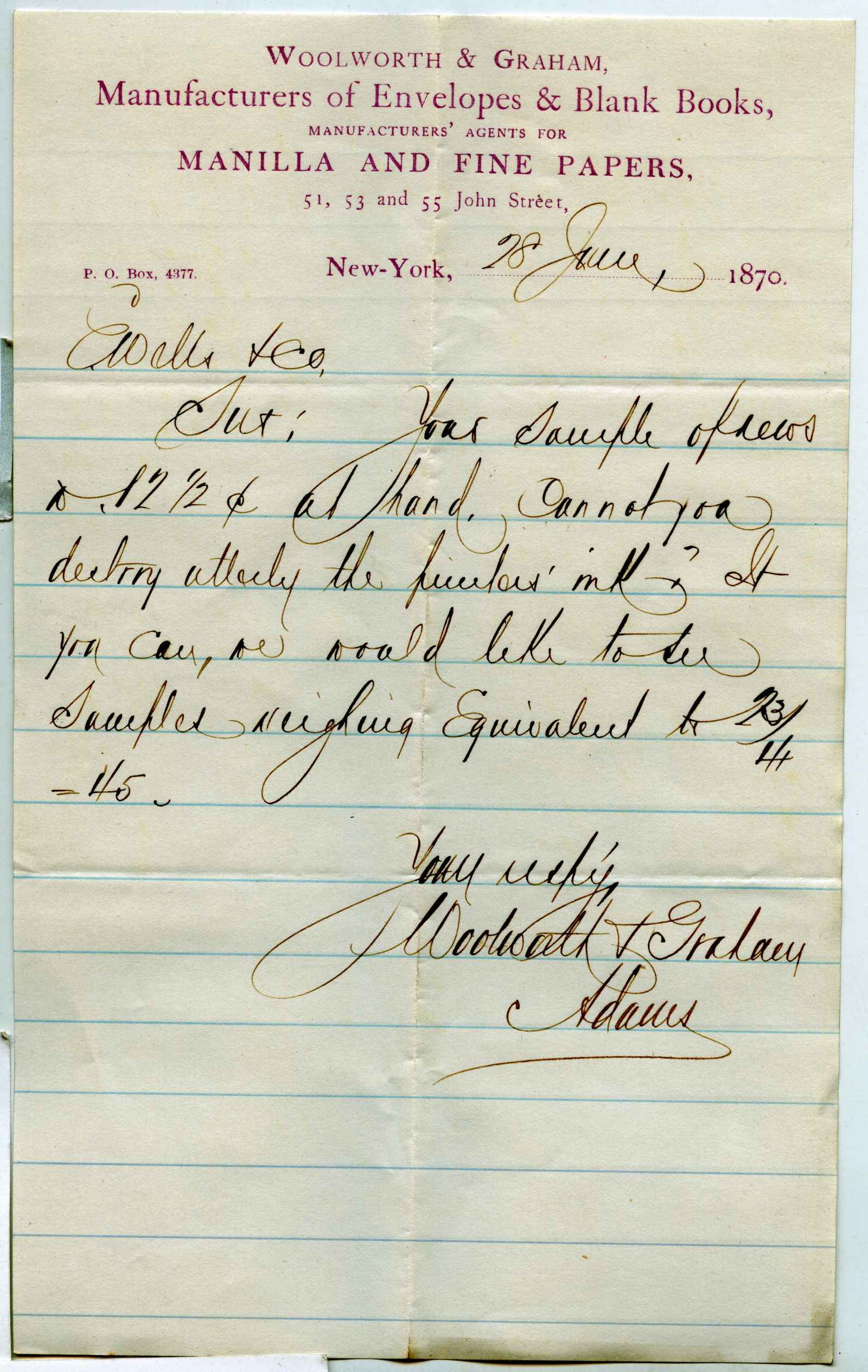 incoming correspondence to the papermaking company of Elisha Wells - circa 1870