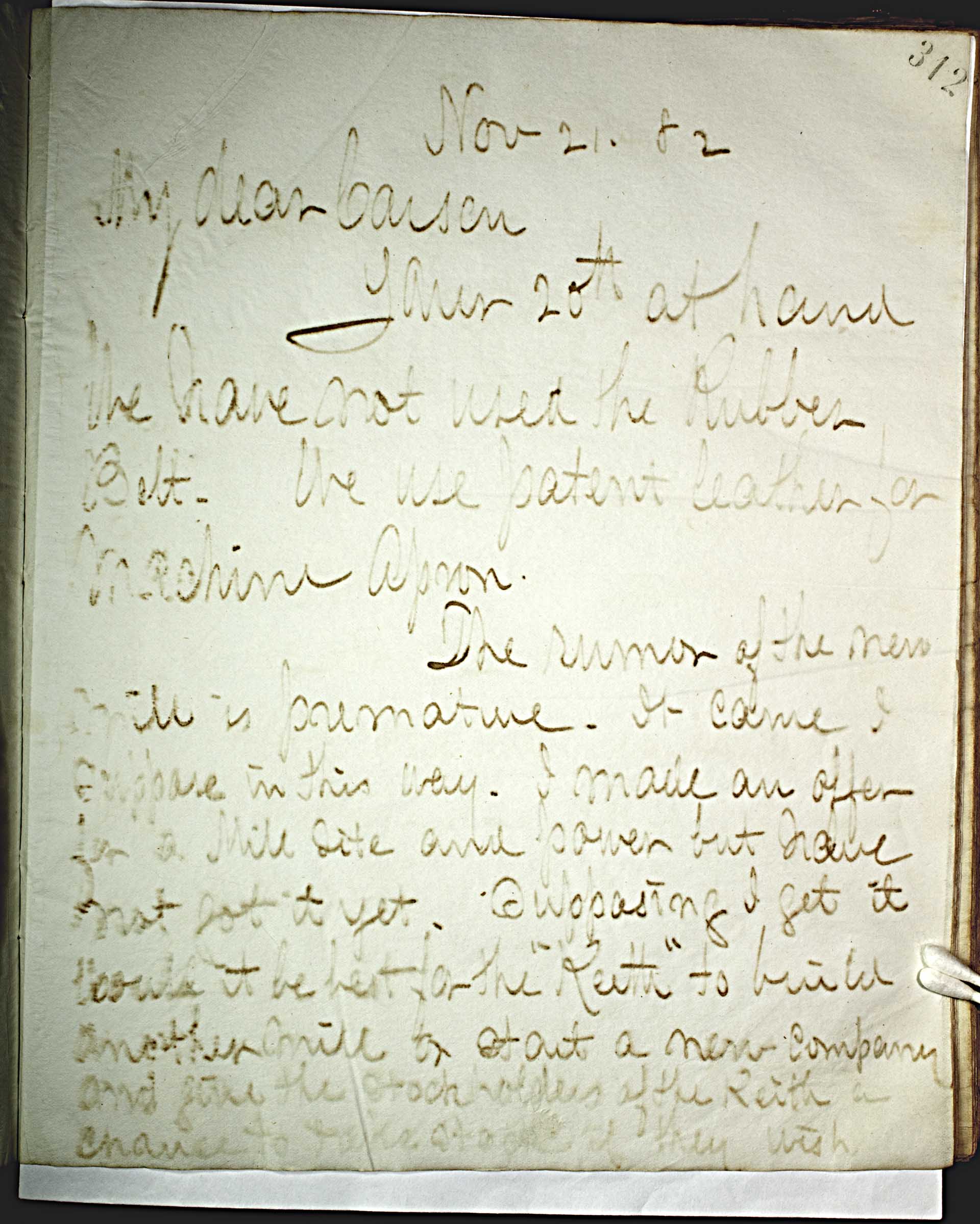 Nov 21, 82 [1882] -- My dear Carson, -- Your 20th at hand. -- We have not used the rubber belt. We use patent leather for machine apron. -- The rumor of the new mill is premature. It came I suppose in this way. I made an offer for a mill site and power but I have not got it yet. Supposing I get it could it be the best for the “Keith” to build another mill or start a new company and give the stockholders of the Keith a chance to take stock if they wish --