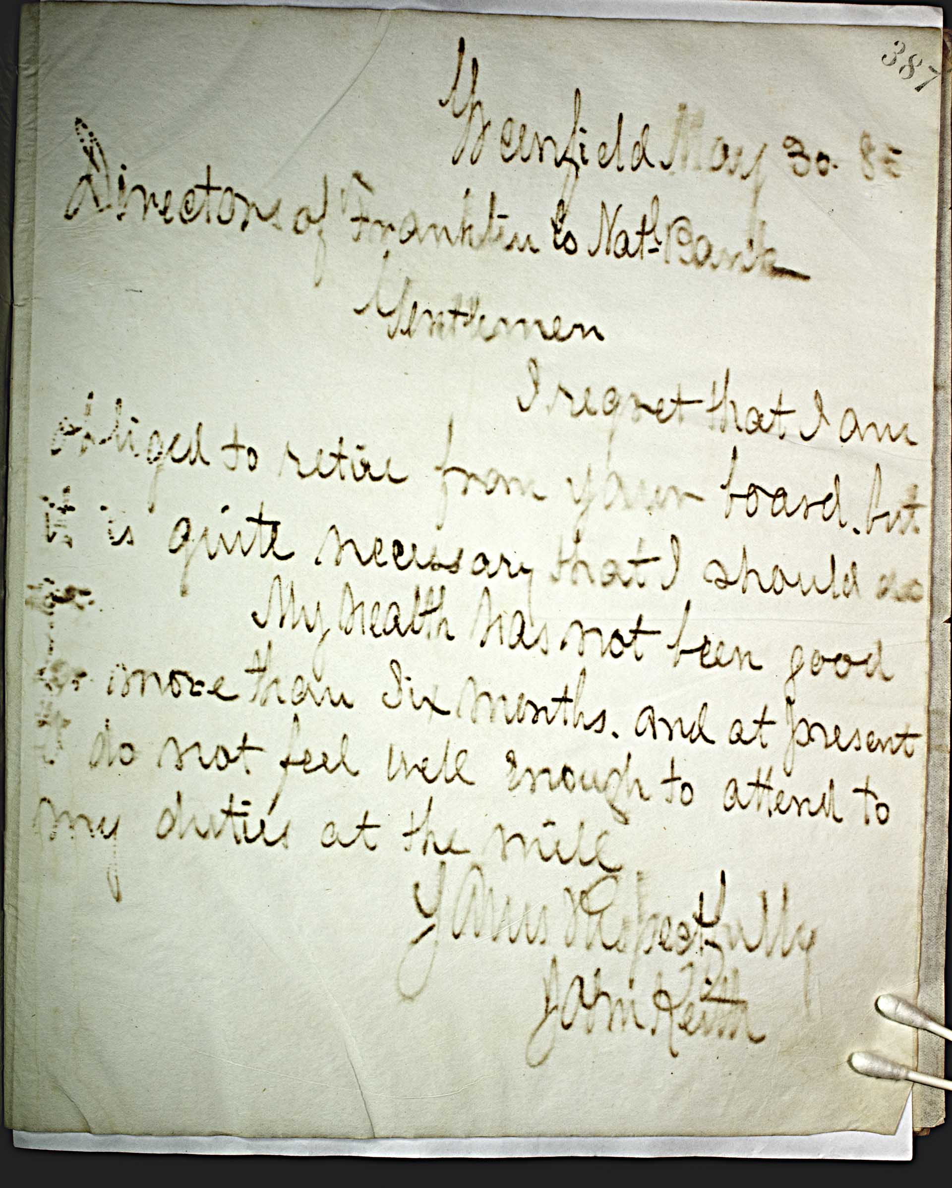 Greenfield, May 30, 85 [1885] -- Directors of Franklin Co. Nat -- l -- Bank -- Gentlemen, -- I regret that I am obliged to retire from your board, but it is quite necessary that I should do so. -- My health has not been good for more than six months and at present I do not feel well enough to attend to my duties at the mill. -- Yours Respectfully -- John Keith --