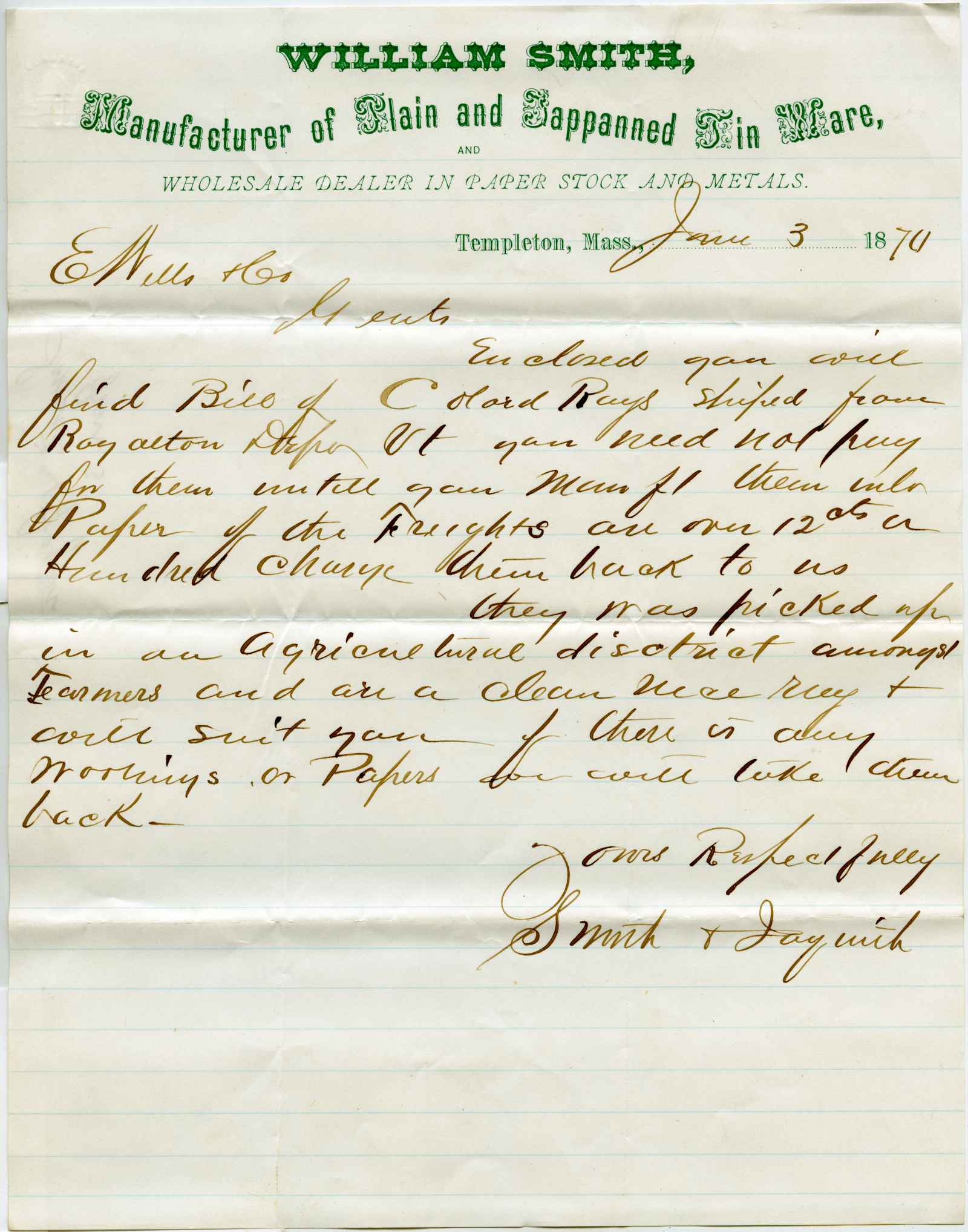 letter; Smith, Willaim - Manufacturer of Plain & Tappanned Tinware - Templeton, Ma.