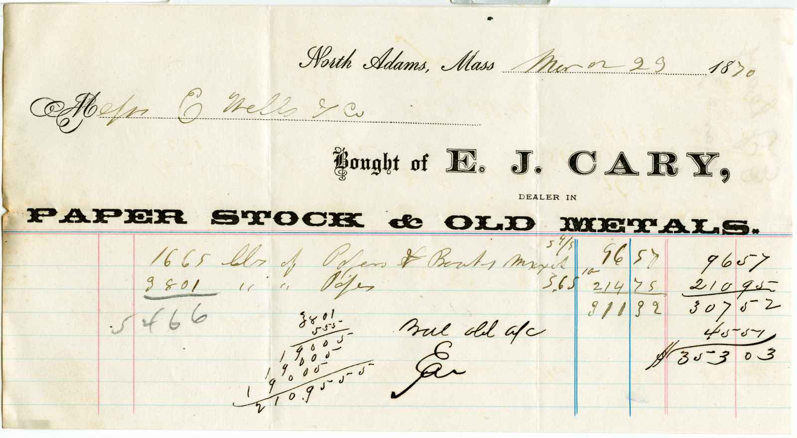 invoice; Cary, E. J. - Paper Stock & Old Metals - North Adams