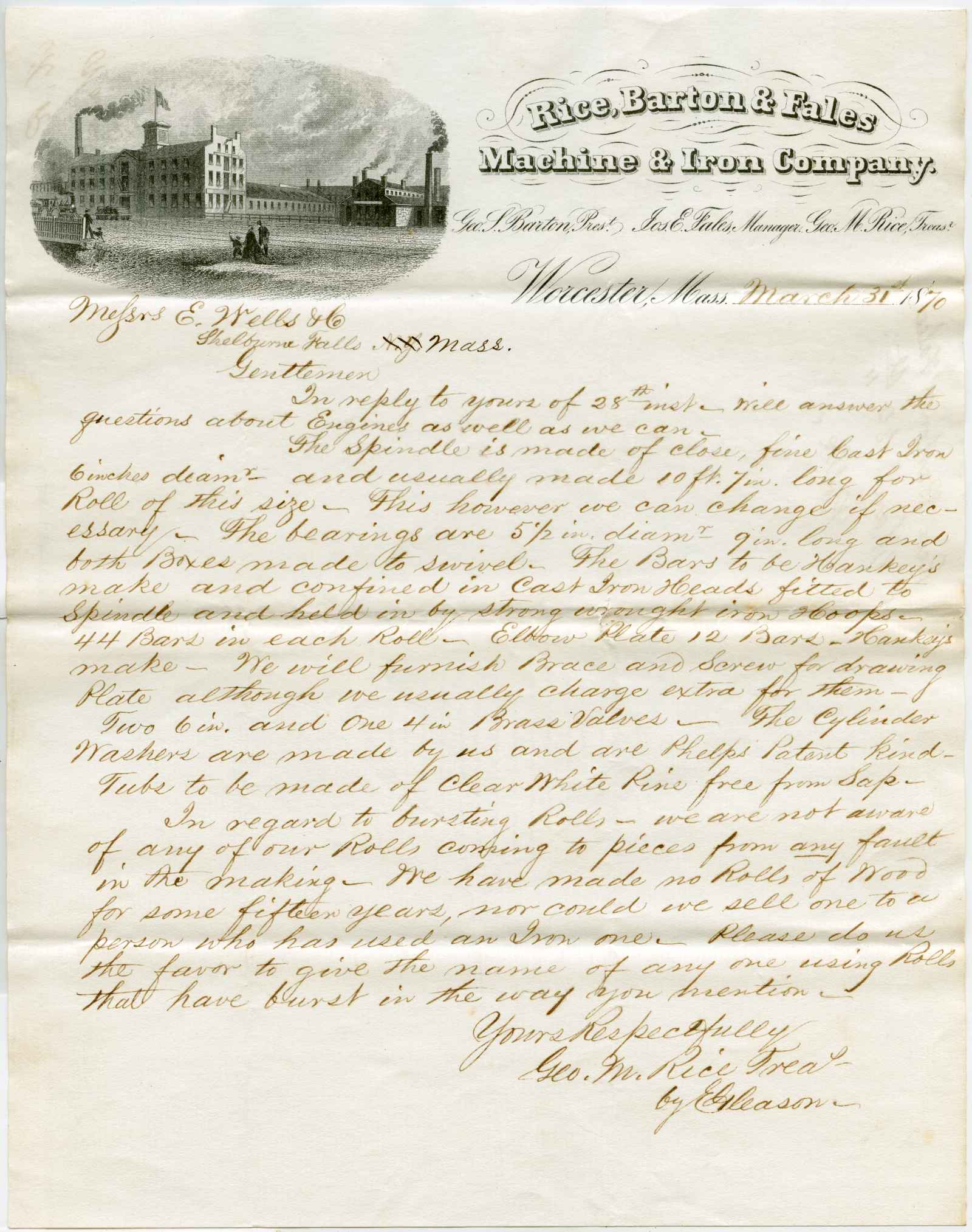 letter; Rice, Barton & Fales - Machine & Iron Company - Worcester, Ma.