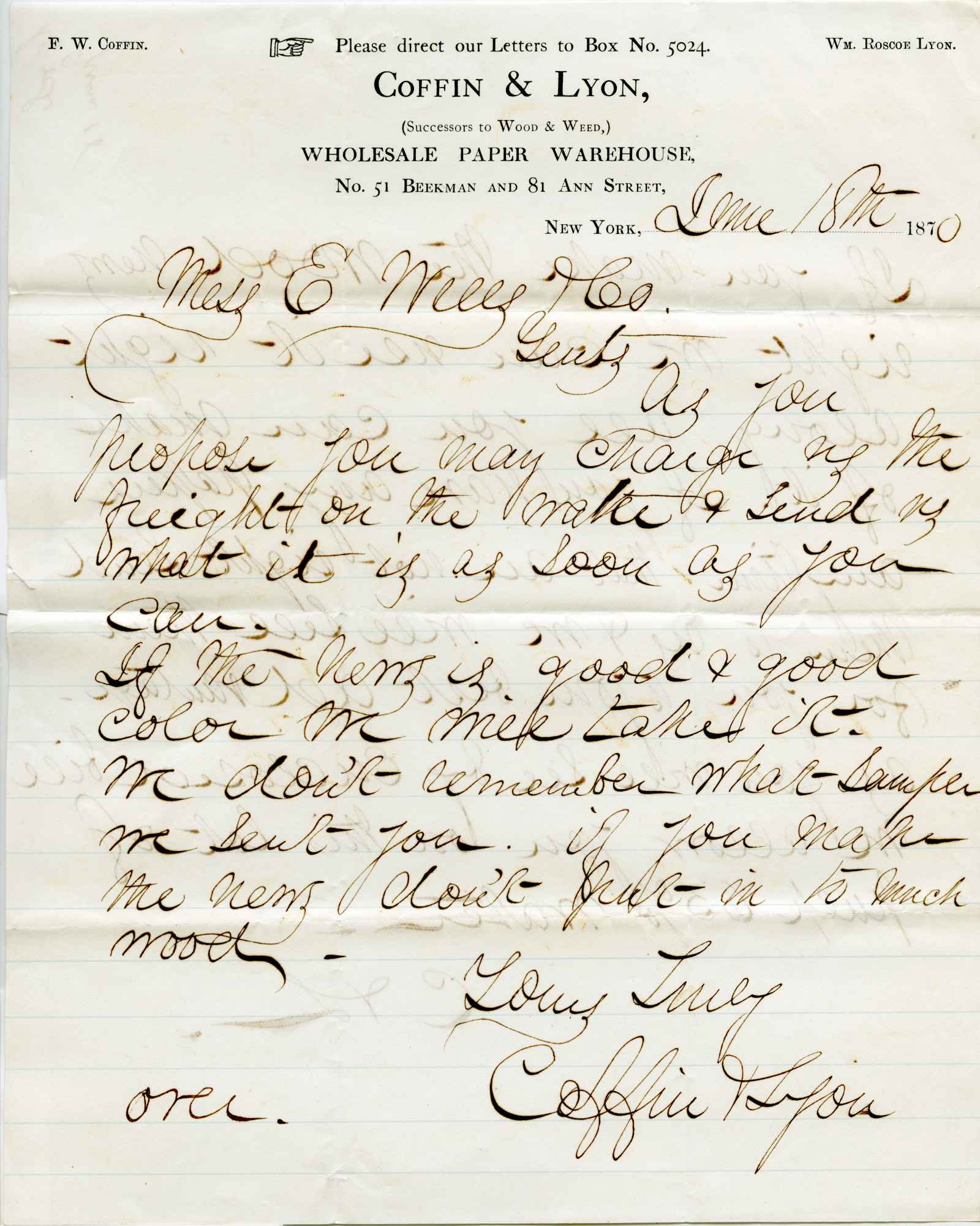incoming correspondence to the papermaking company of Elisha Wells - circa 1870