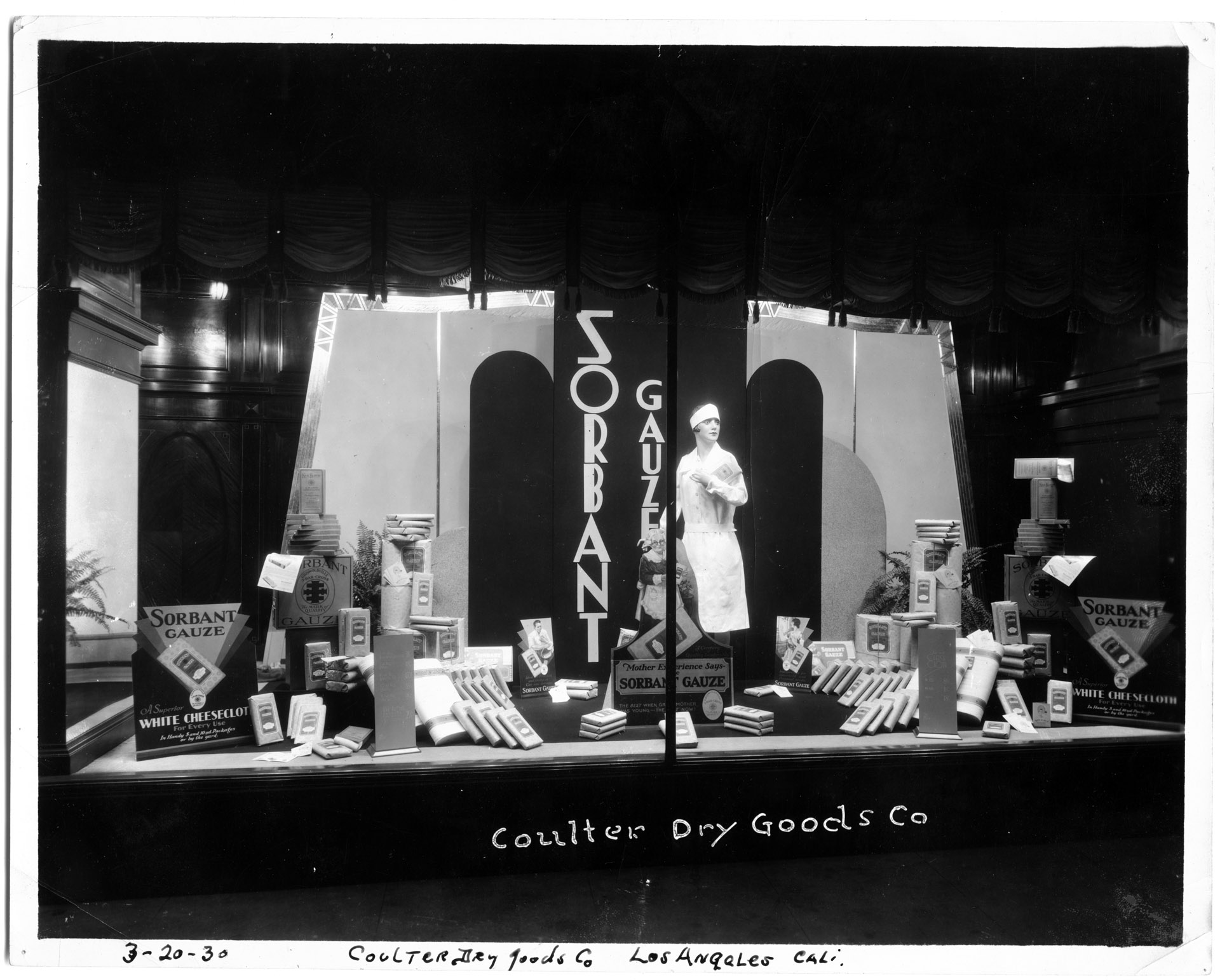 Store Window - 3/20/1930 - showing Sorbant Gauze products - Coulton Dry Goods Co. Los Angeles CA - Frank C. Elliott Photographers 2842 W. 8th St. Los Angeles - DUnkirk 8344