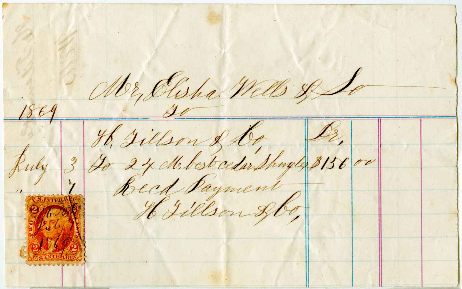 receipt; Tillson, H. - Cedar Shingles - local ?